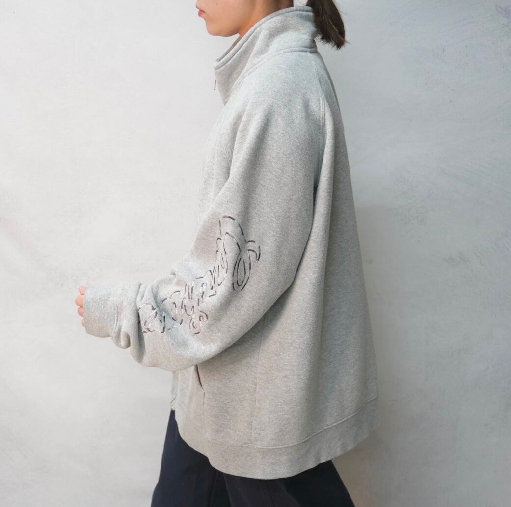 グレーボディに、袖を走る立体的なロゴ刺繍.