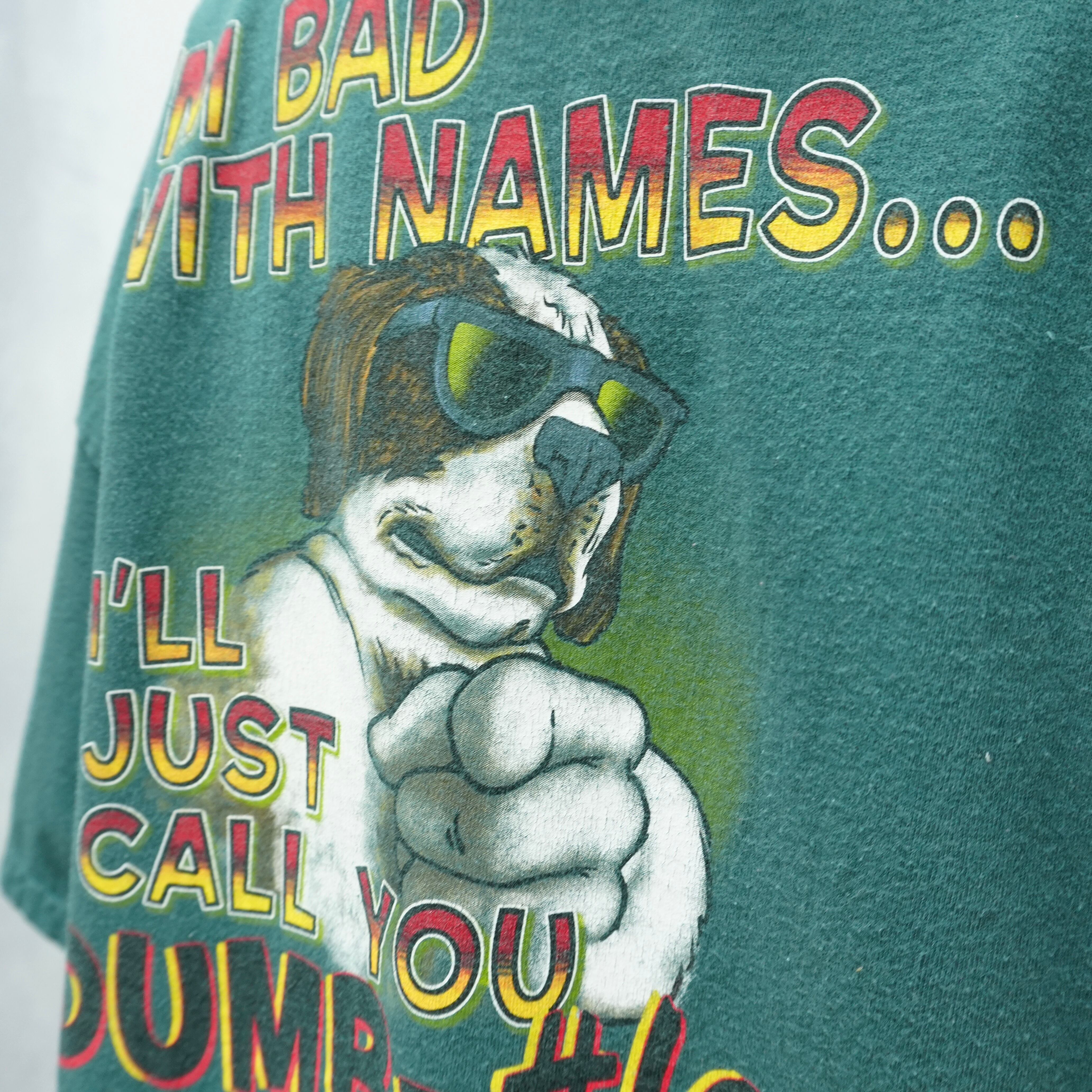 深緑寄りのグリーンボディに、フロントはワンポイント刺繍、そして背中には強烈なメッセージと犬のグラフィック.