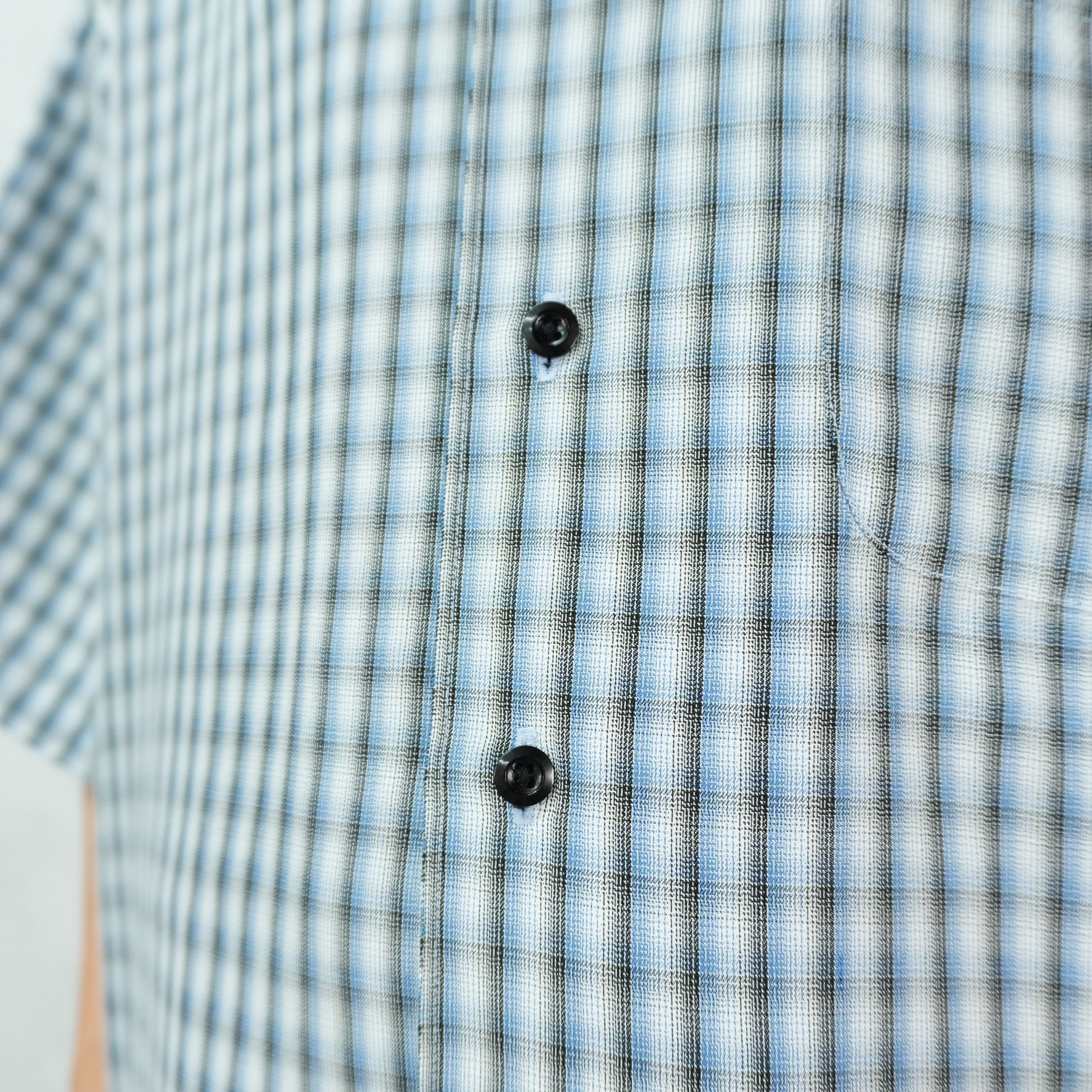 くすみブルー×ホワイト×ブラックの3色で構成されるギンガム調のブロックチェック柄.