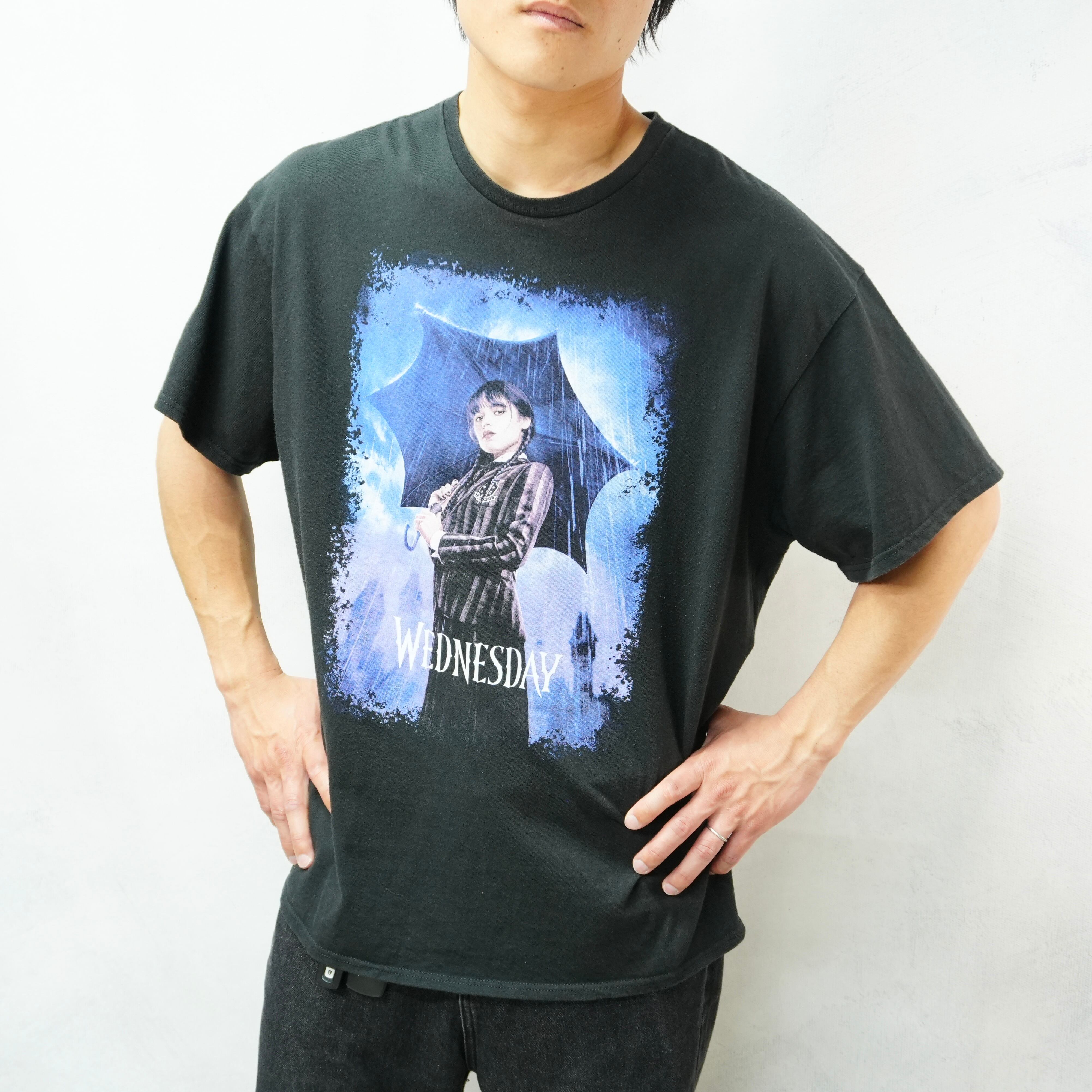 Netflixオリジナルドラマ『WEDNESDAY』の主人公・ウェンズデーがフロントに描かれた、オフィシャルライセンスTシャツ.