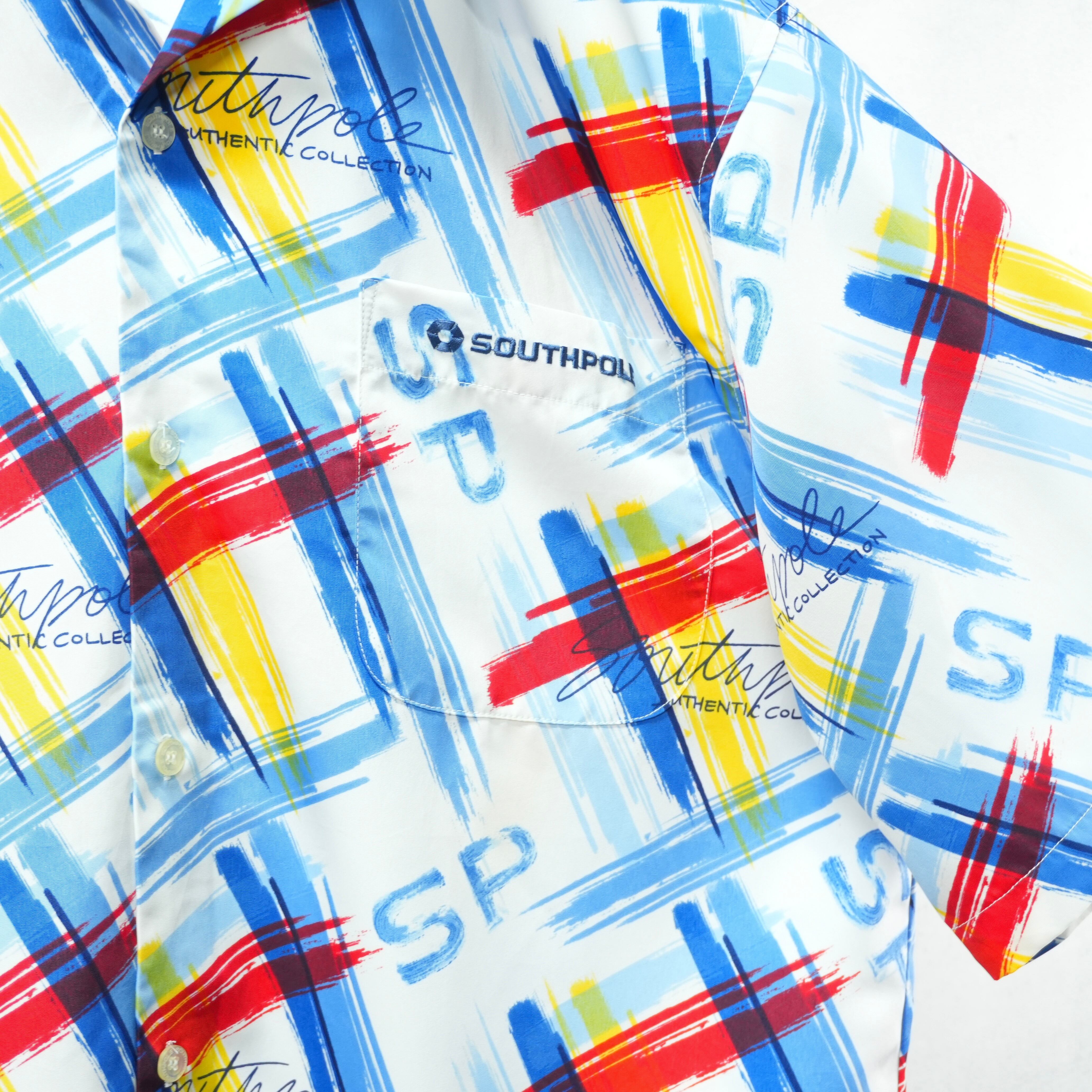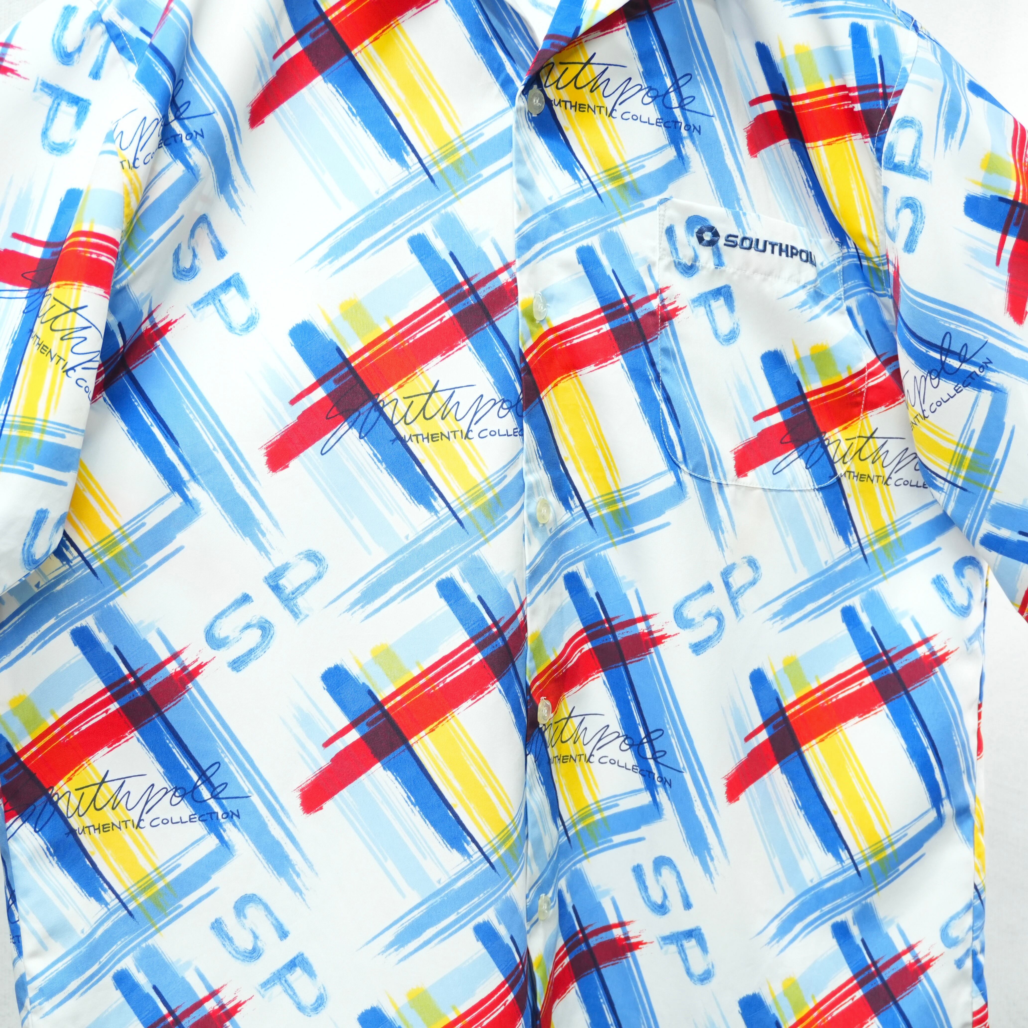 " 'SOUTH POLE' over silhouette multi color design open collar shirt "