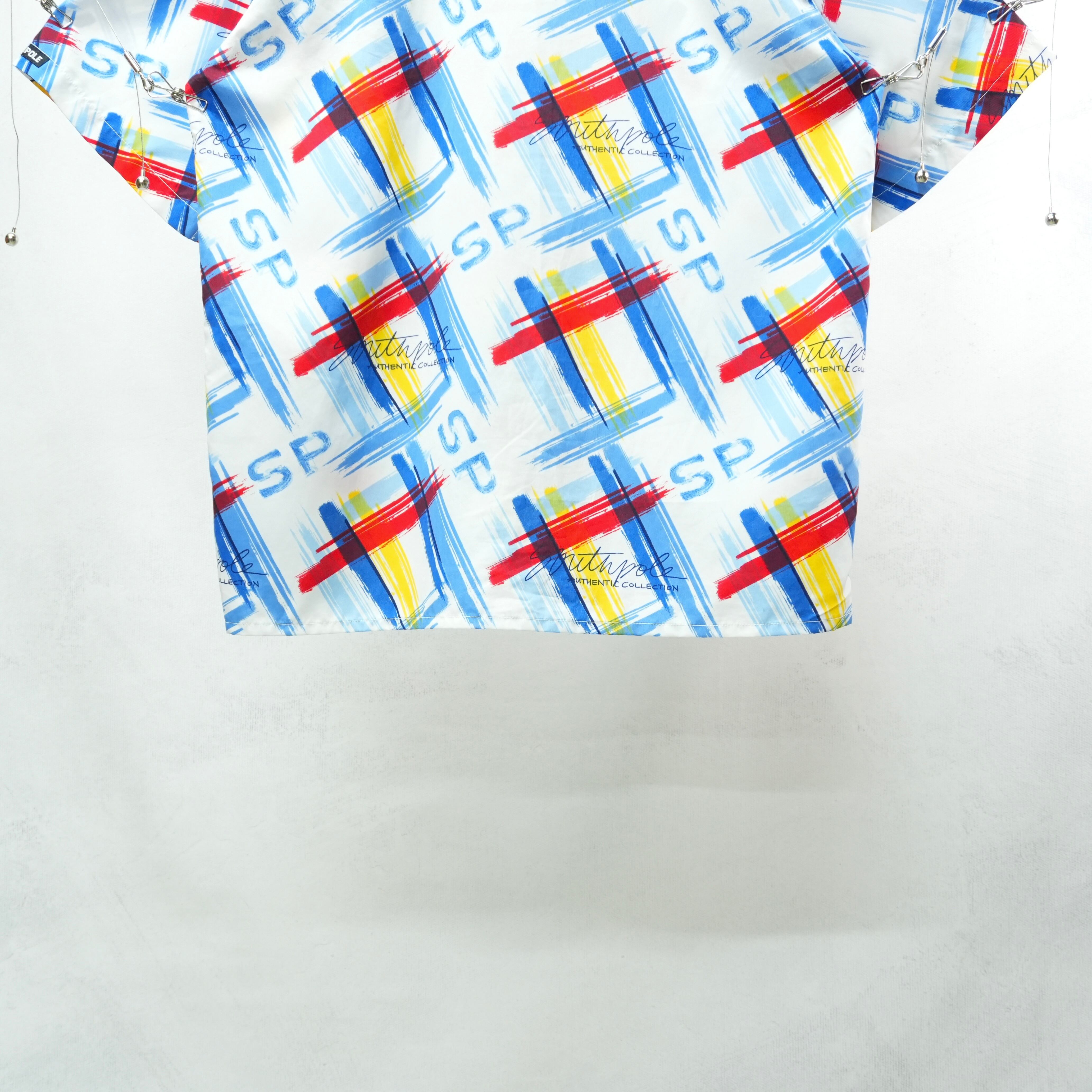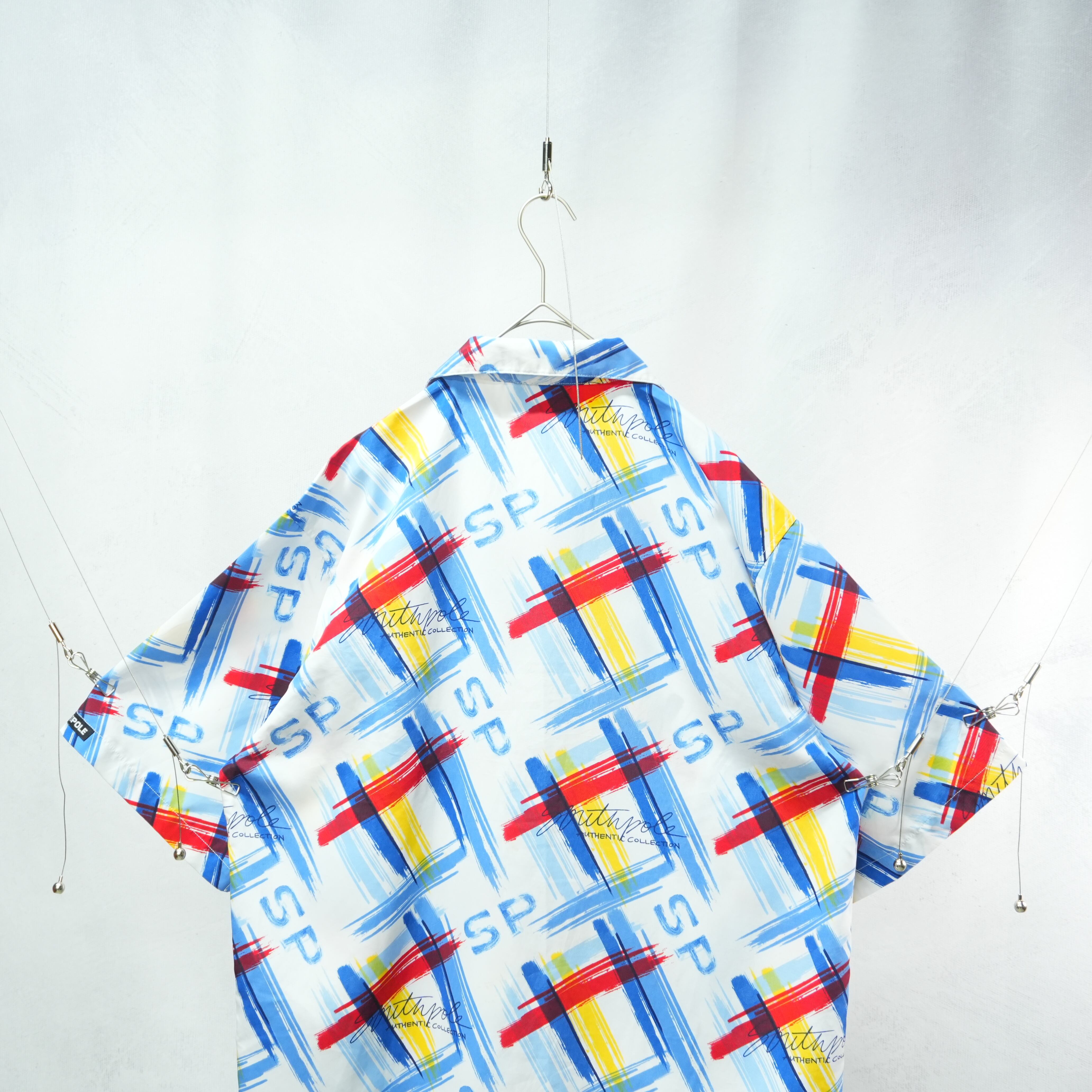 黄色・赤・青・水色をラフに重ねたペイント柄が、90s~2000年代のストリートカルチャーを感じさせる仕上がり.