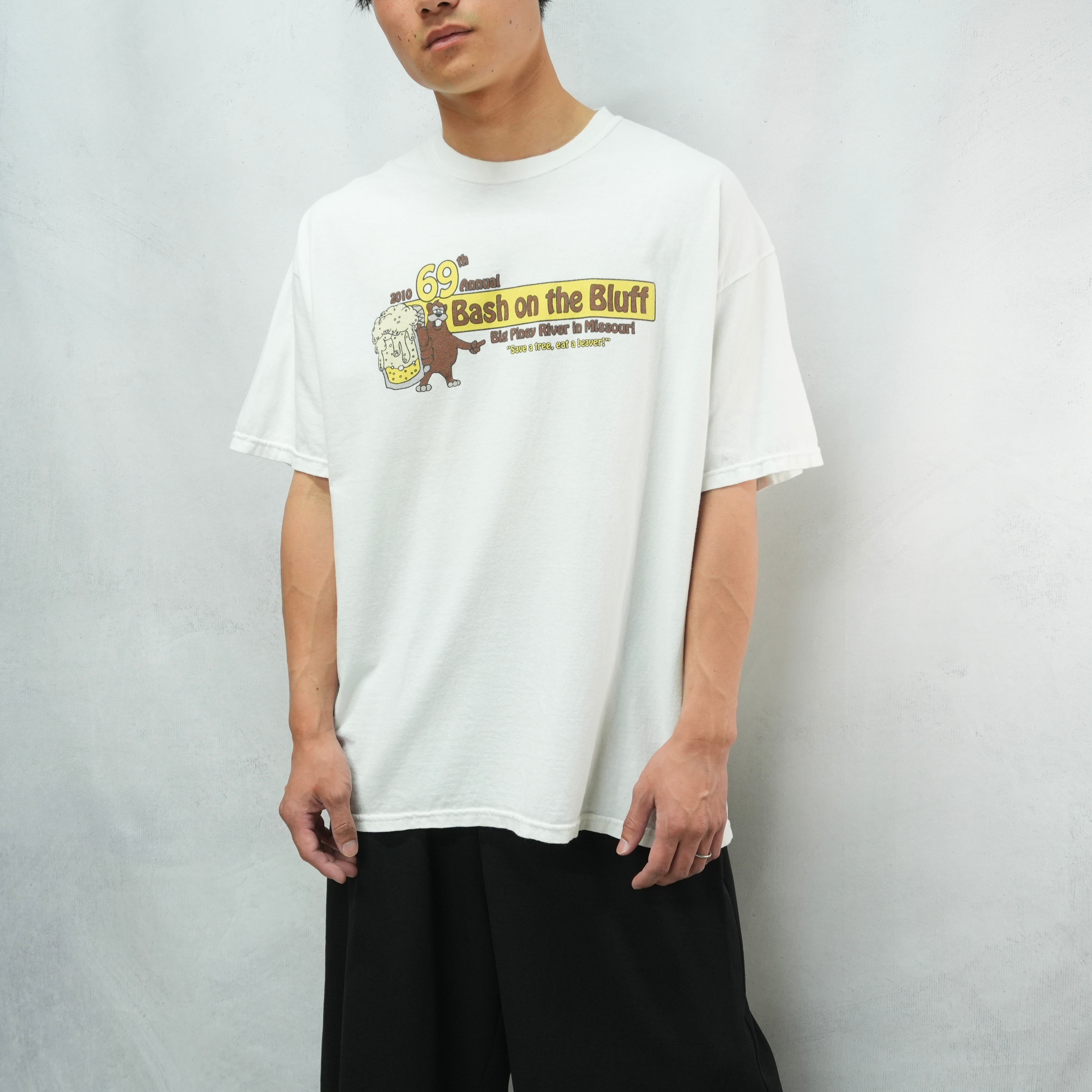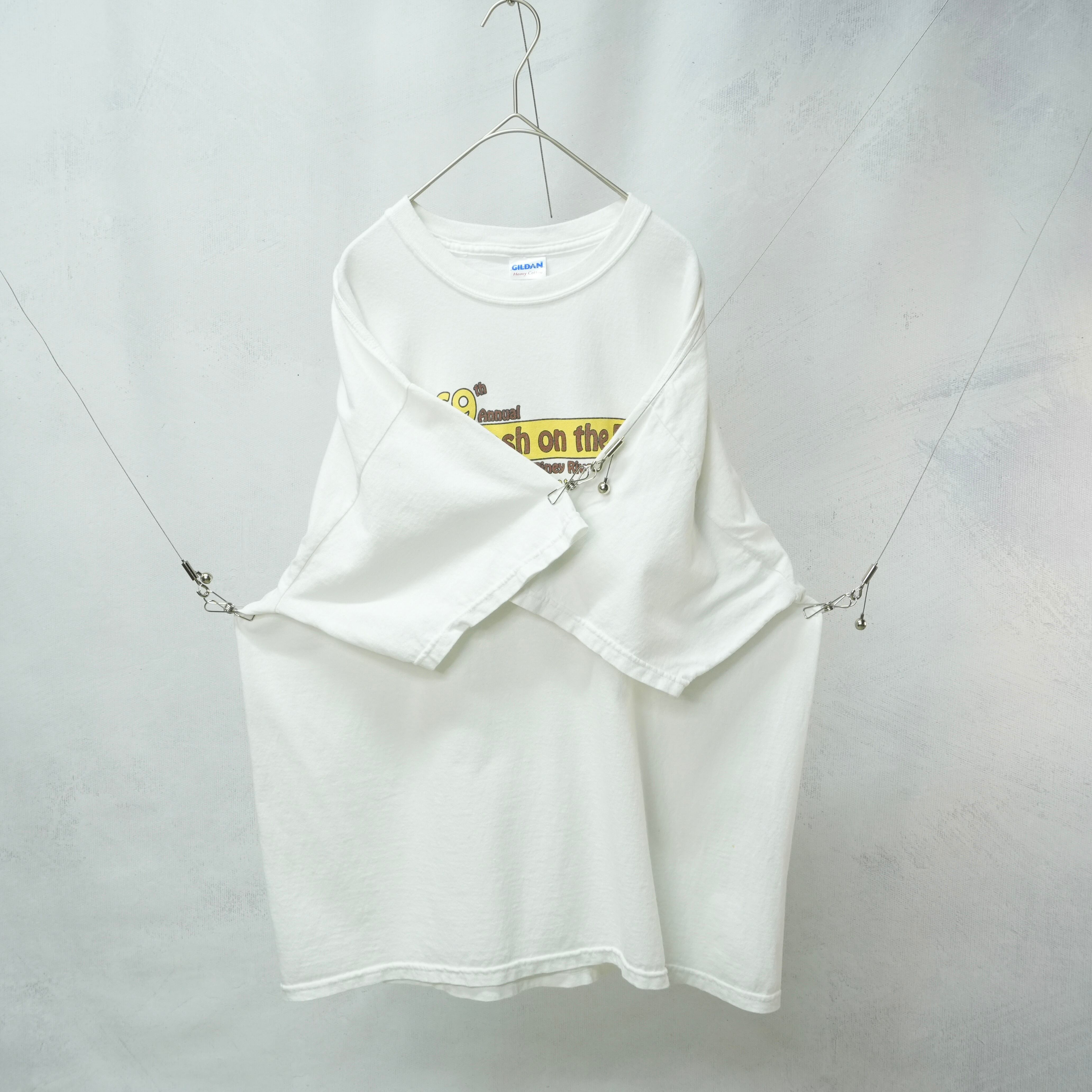 ホワイトボディに映えるレトロポップなプリントは、古着らしいユーモアと抜け感を演出.