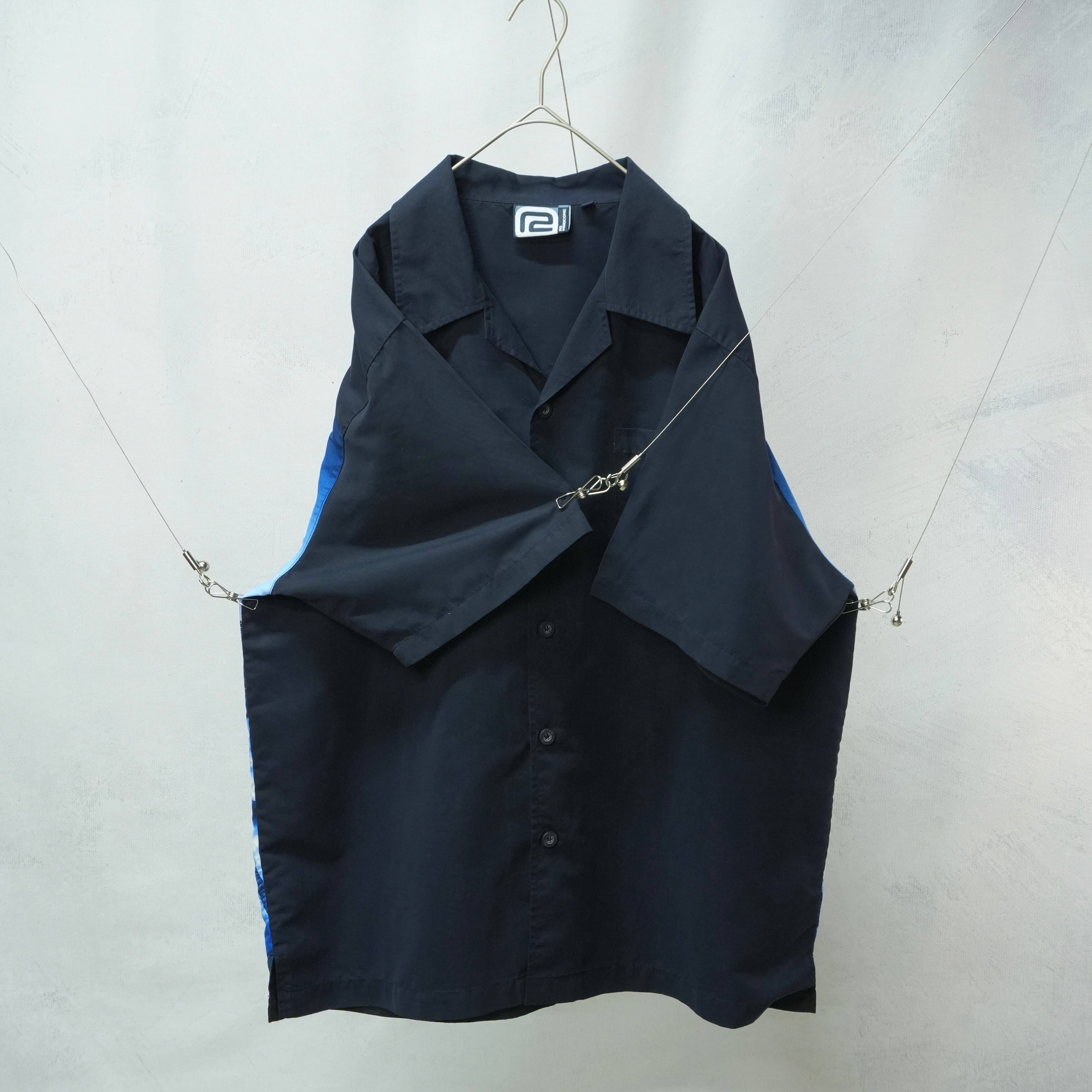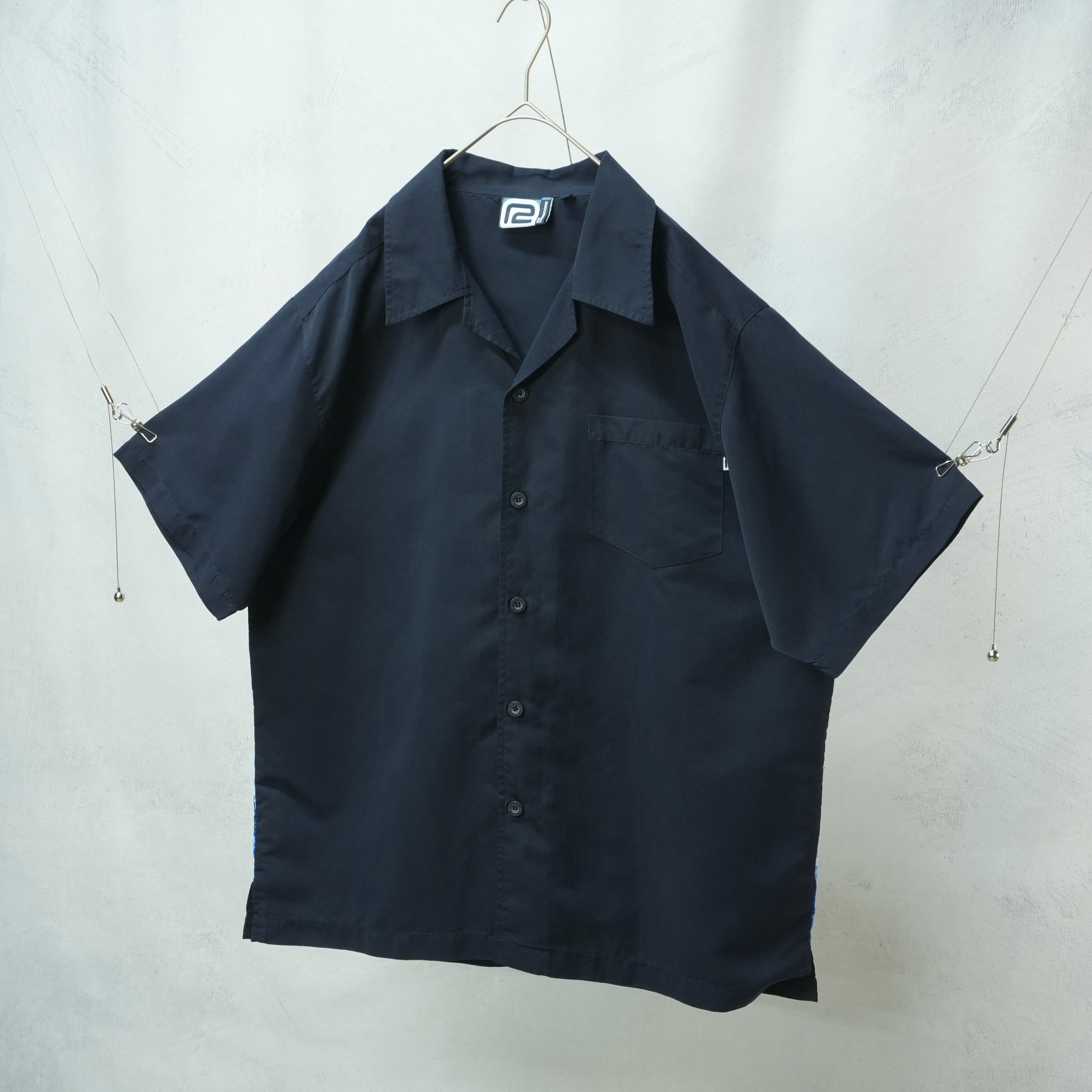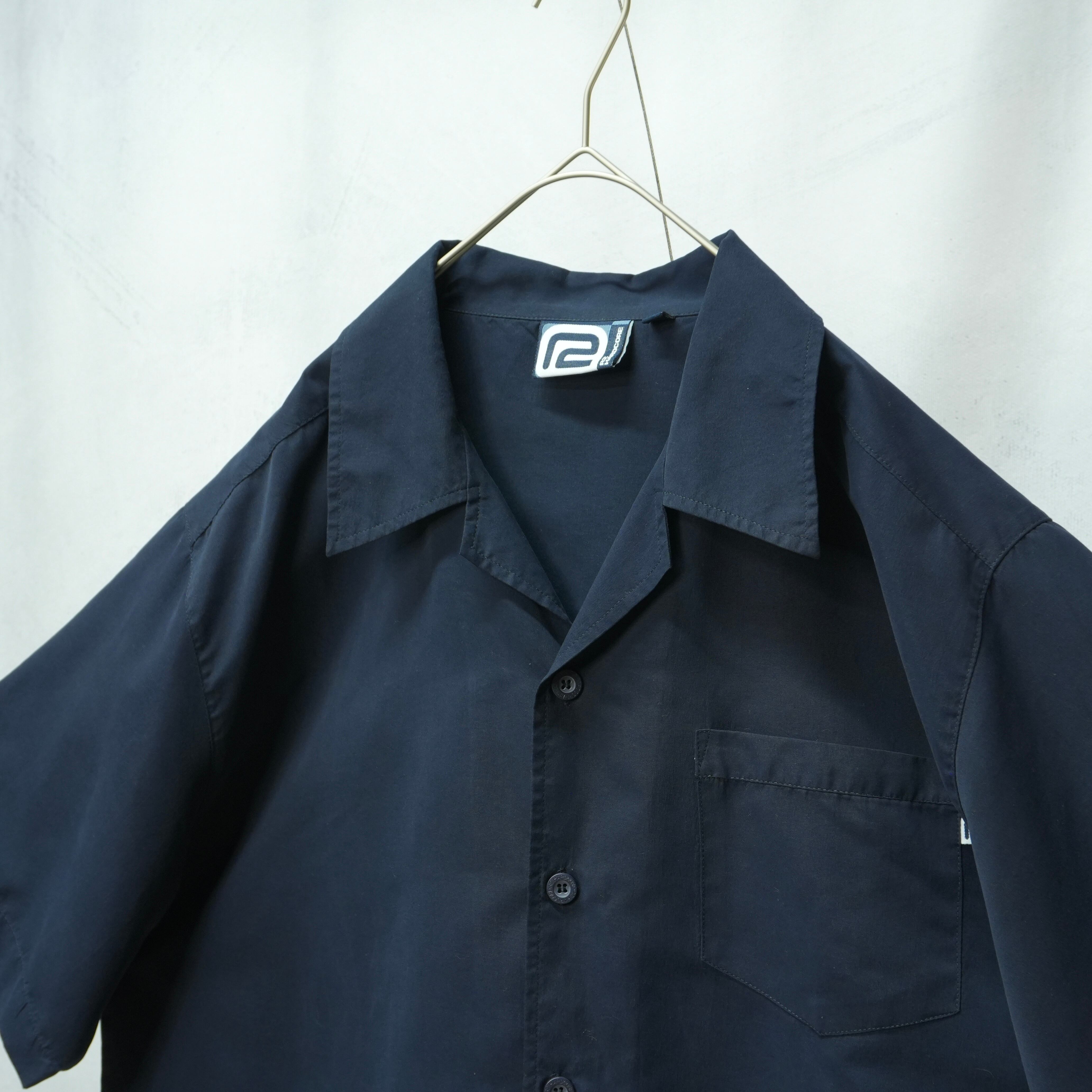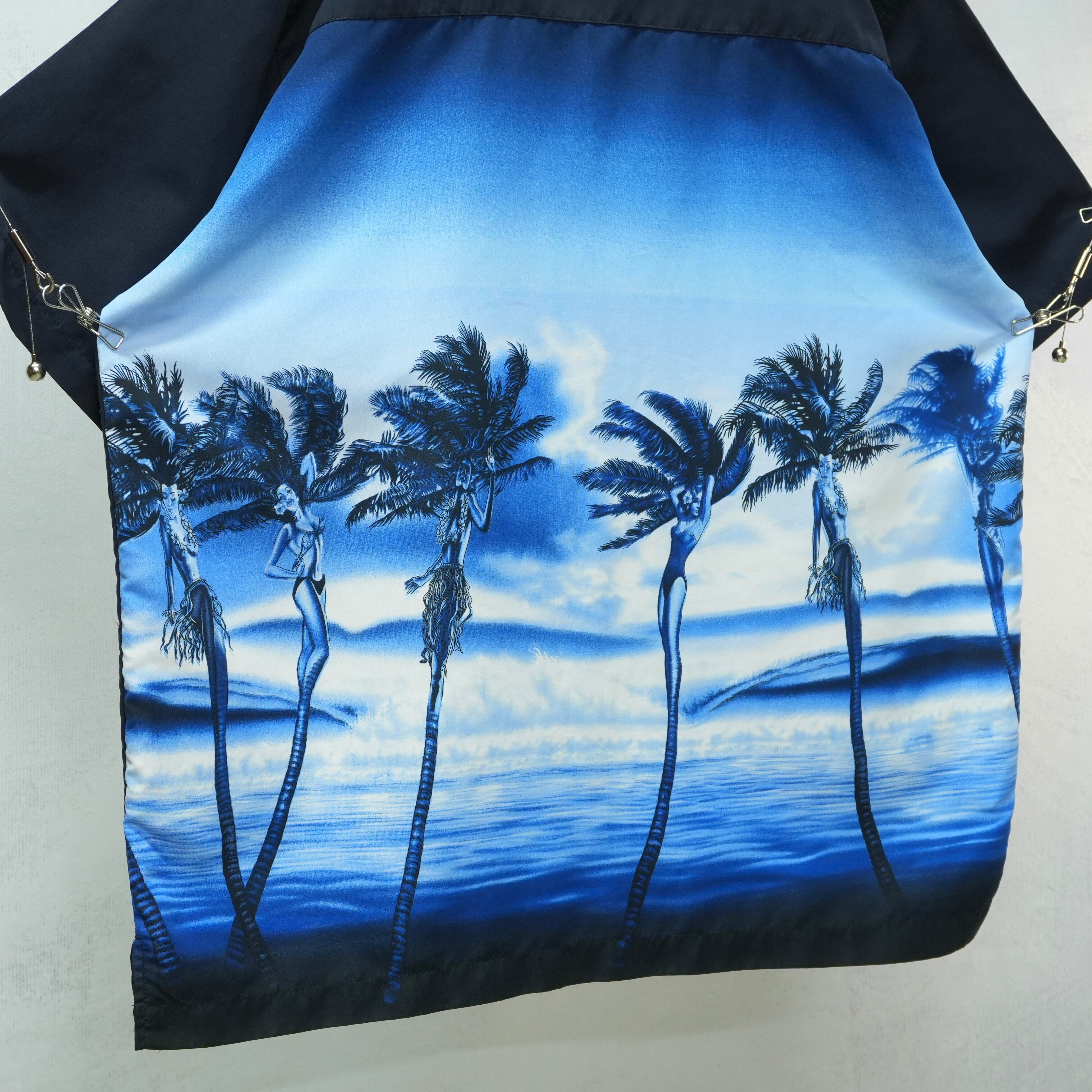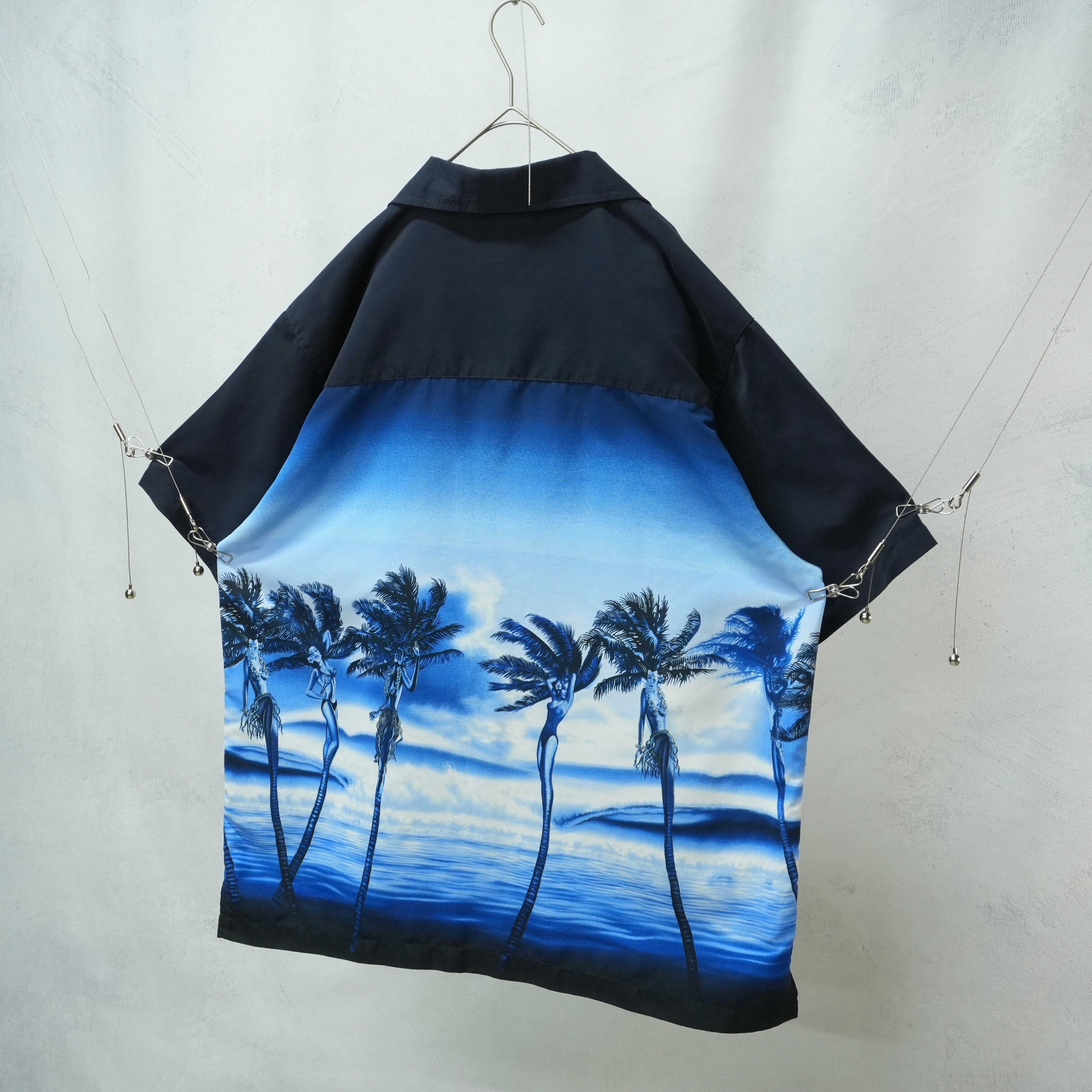 " 'R2 hard core' over silhouette navy color Photo Art design open-collar aloha shirt "