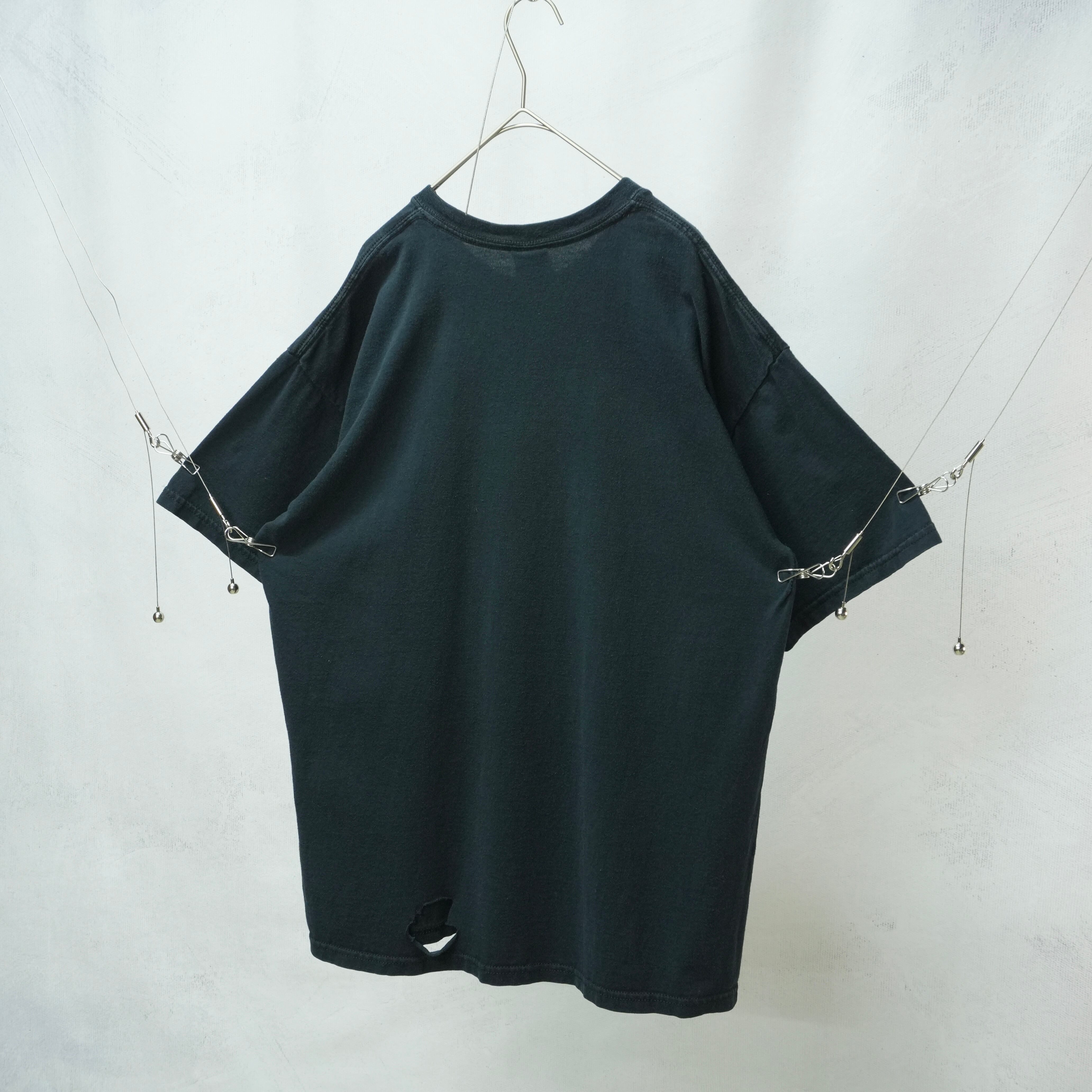 ブラックボディに赤とオレンジのグラデーションが映え、存在感抜群のグラフィックTシャツ.