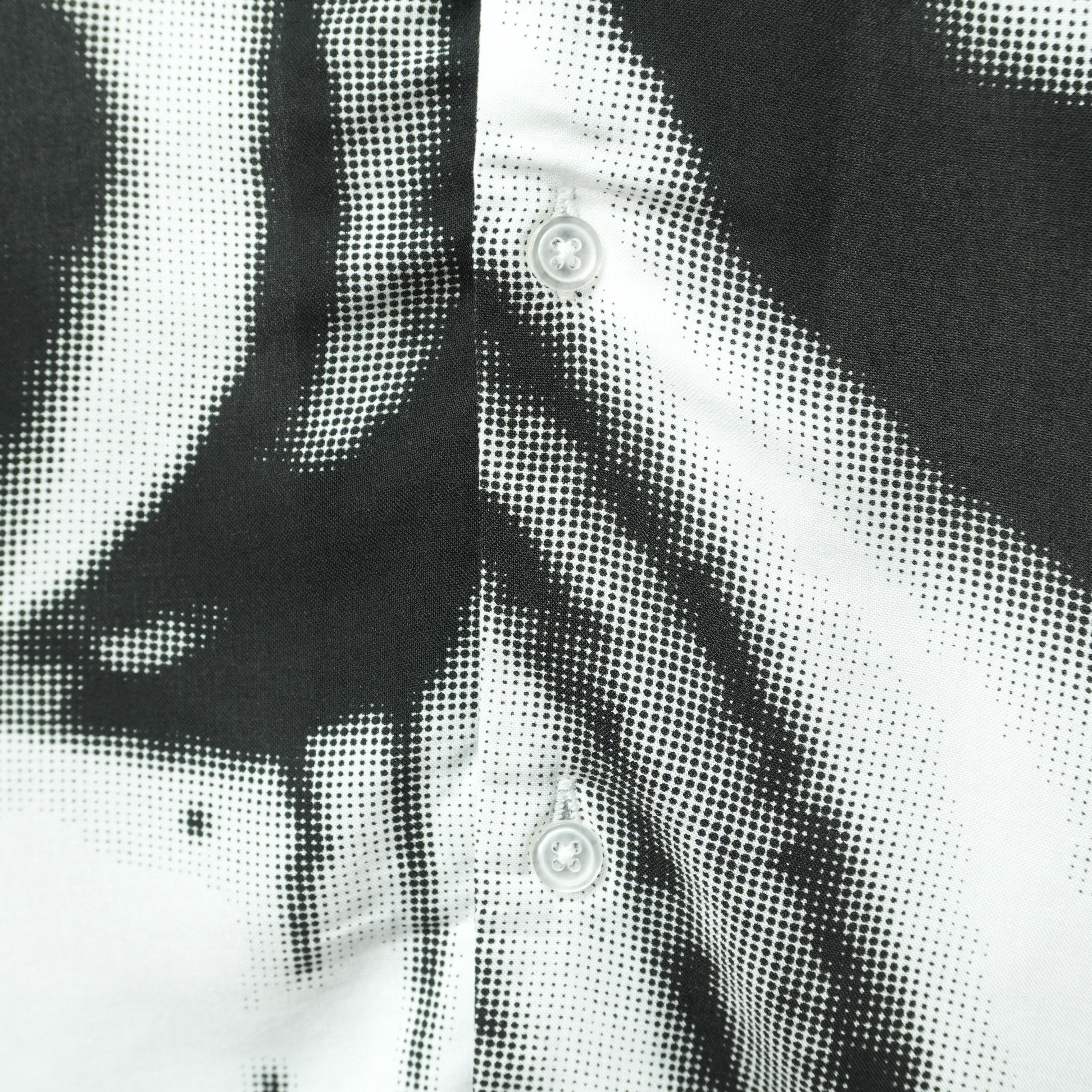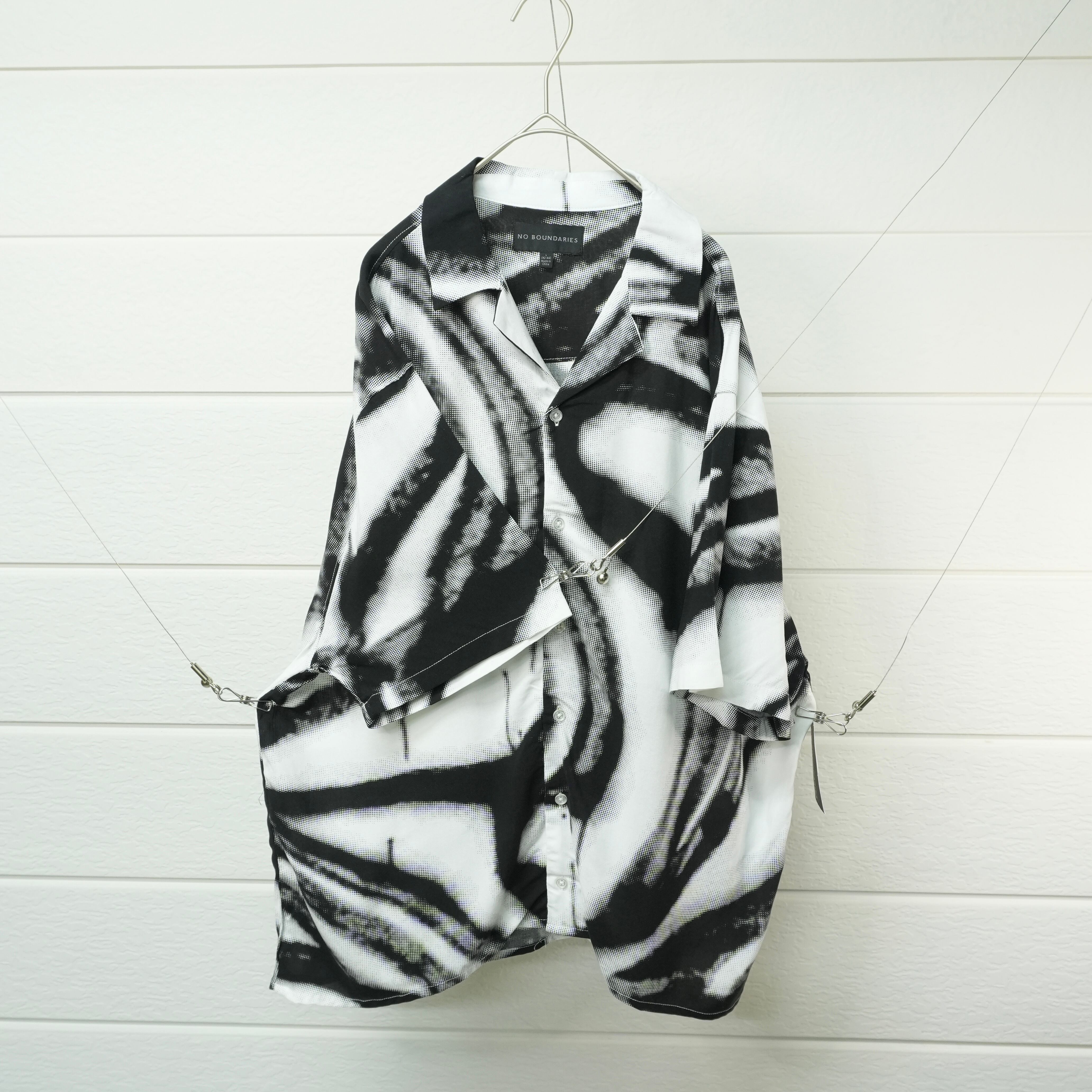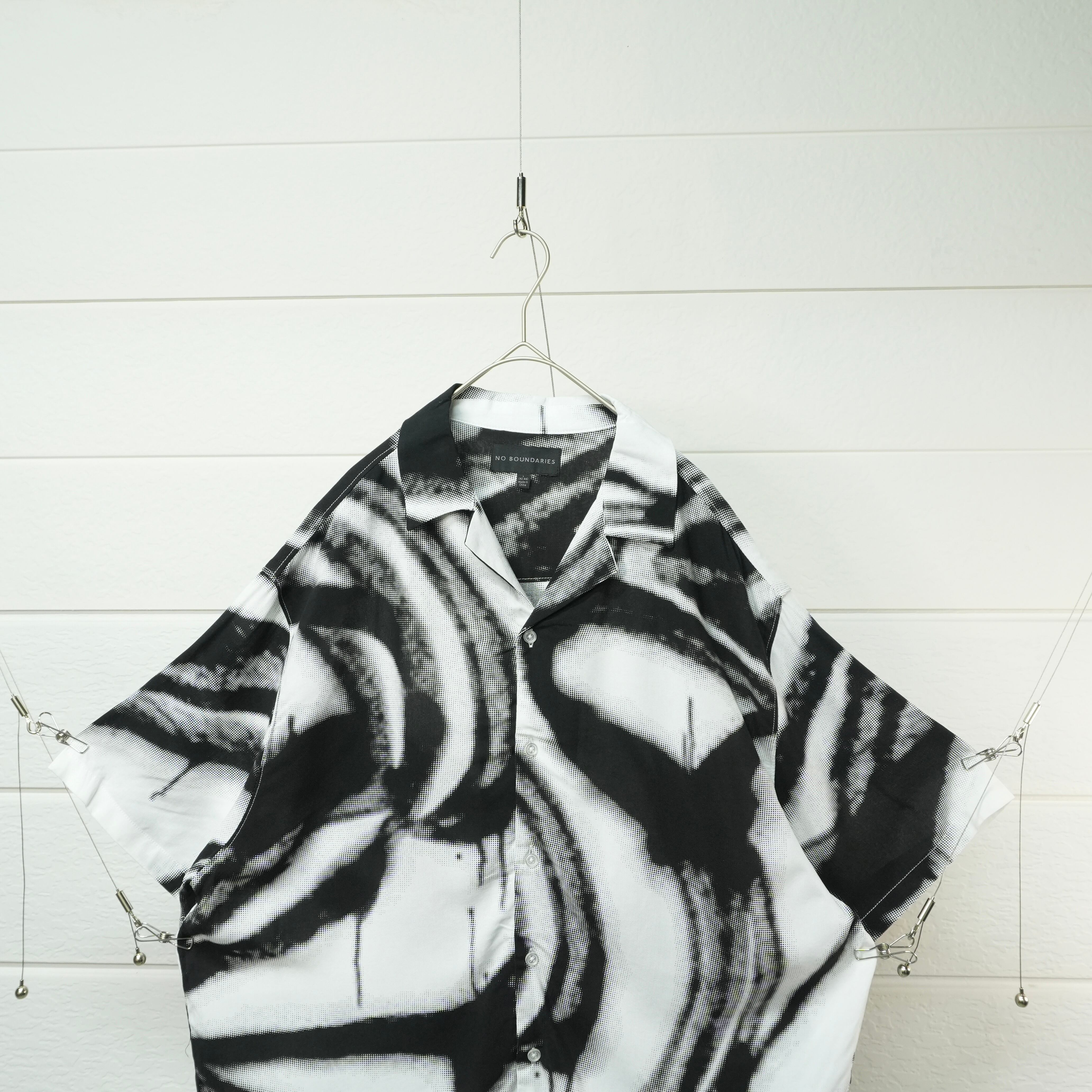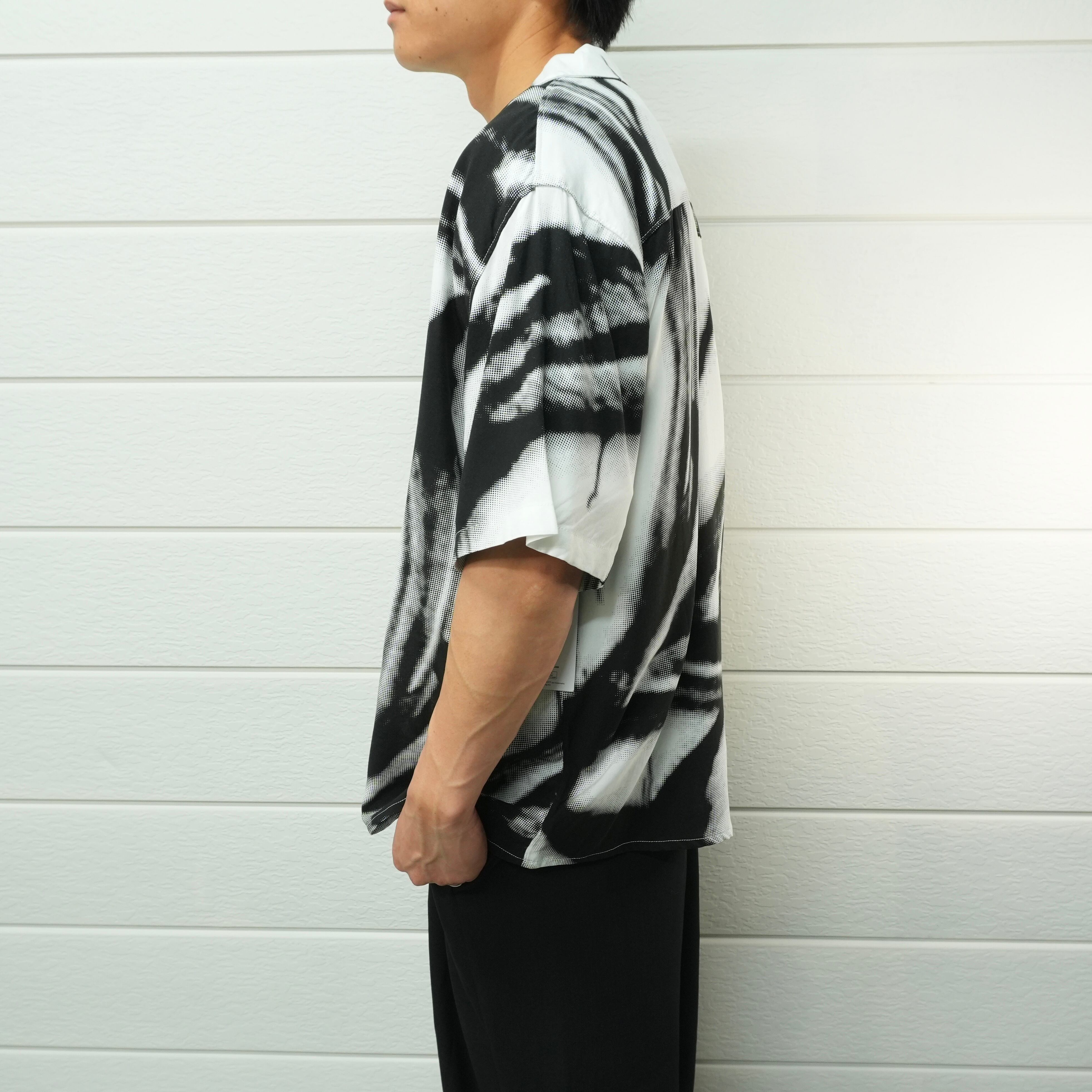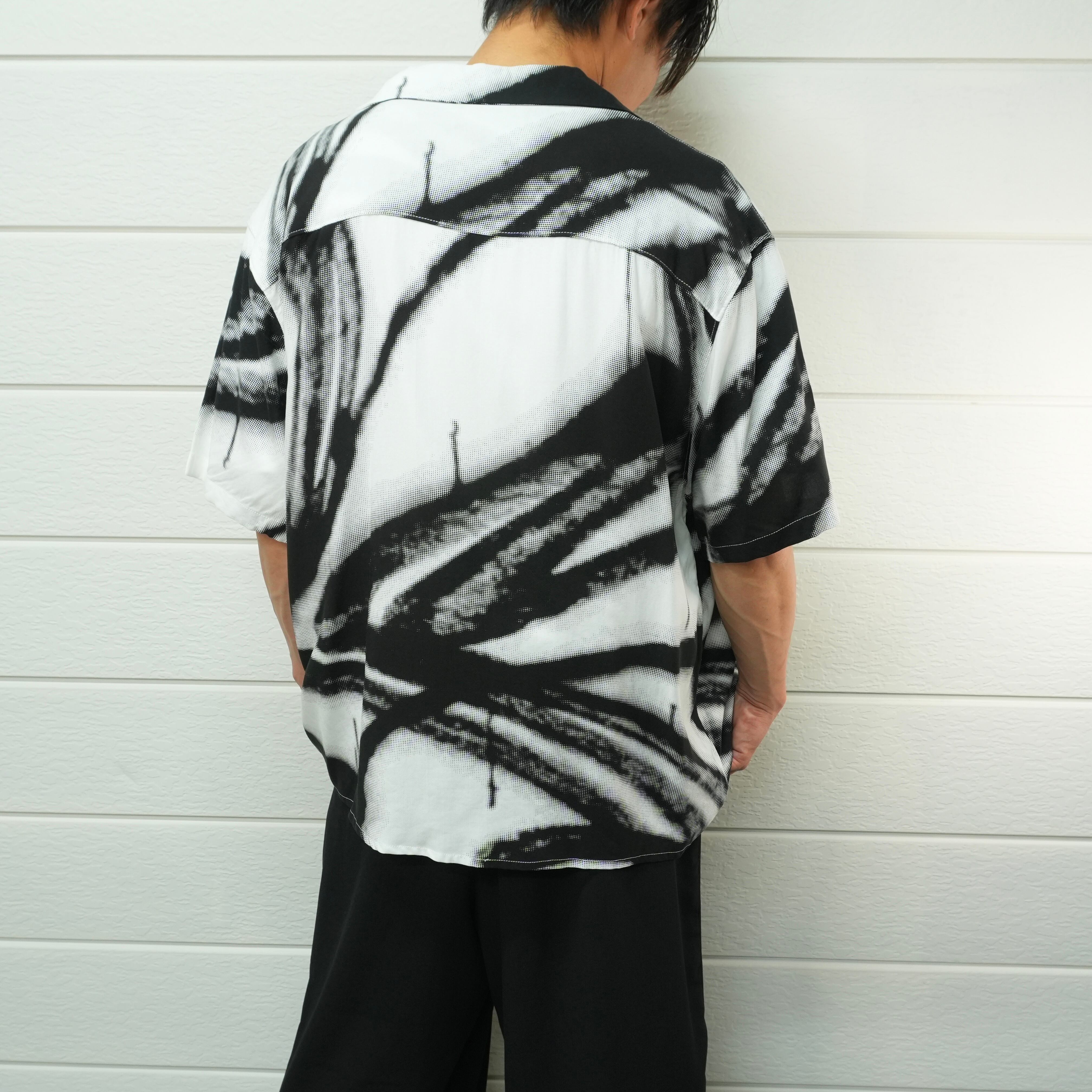 ブラック×ホワイトのグラフィックが目を惹くレーヨン素材のオープンカラーシャツ.