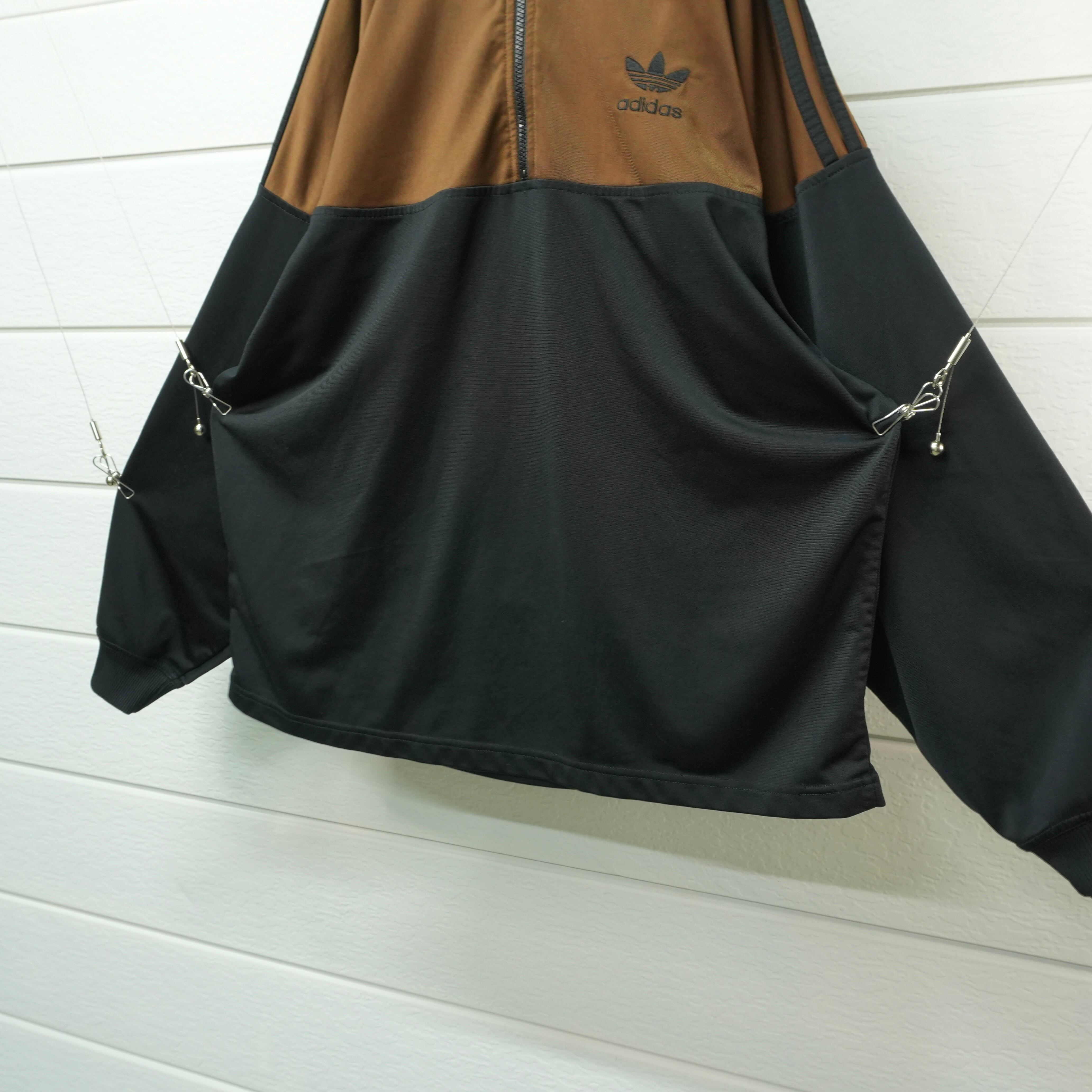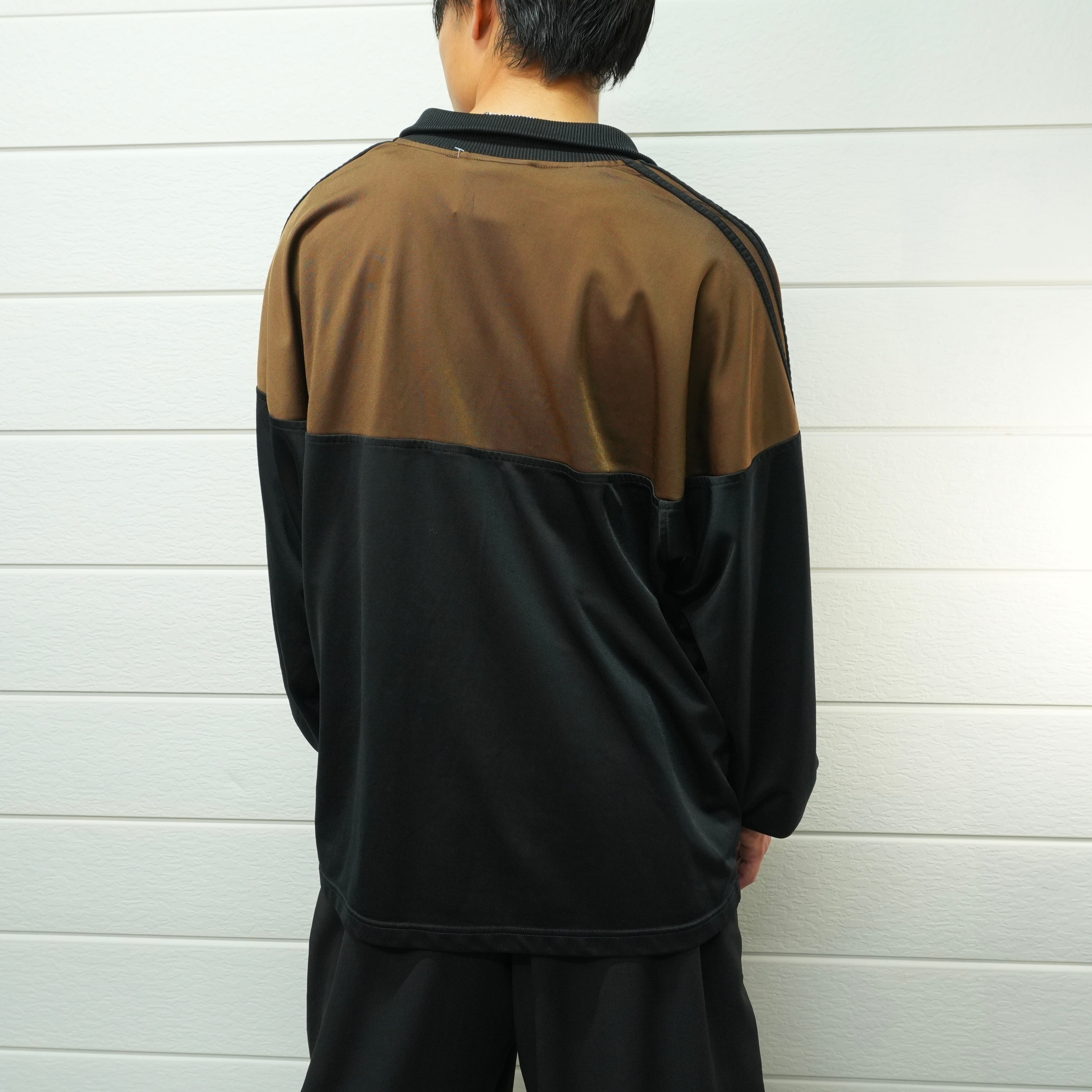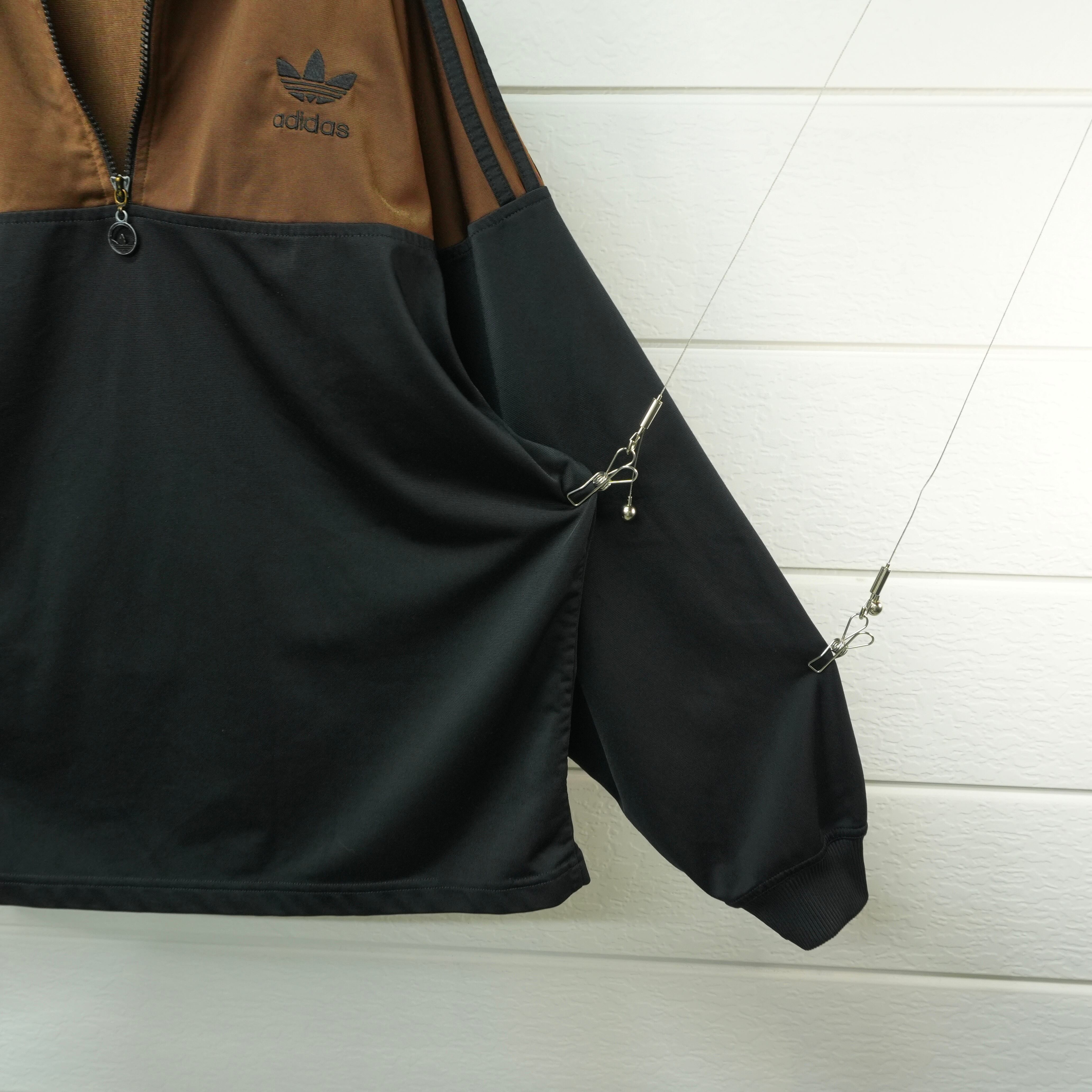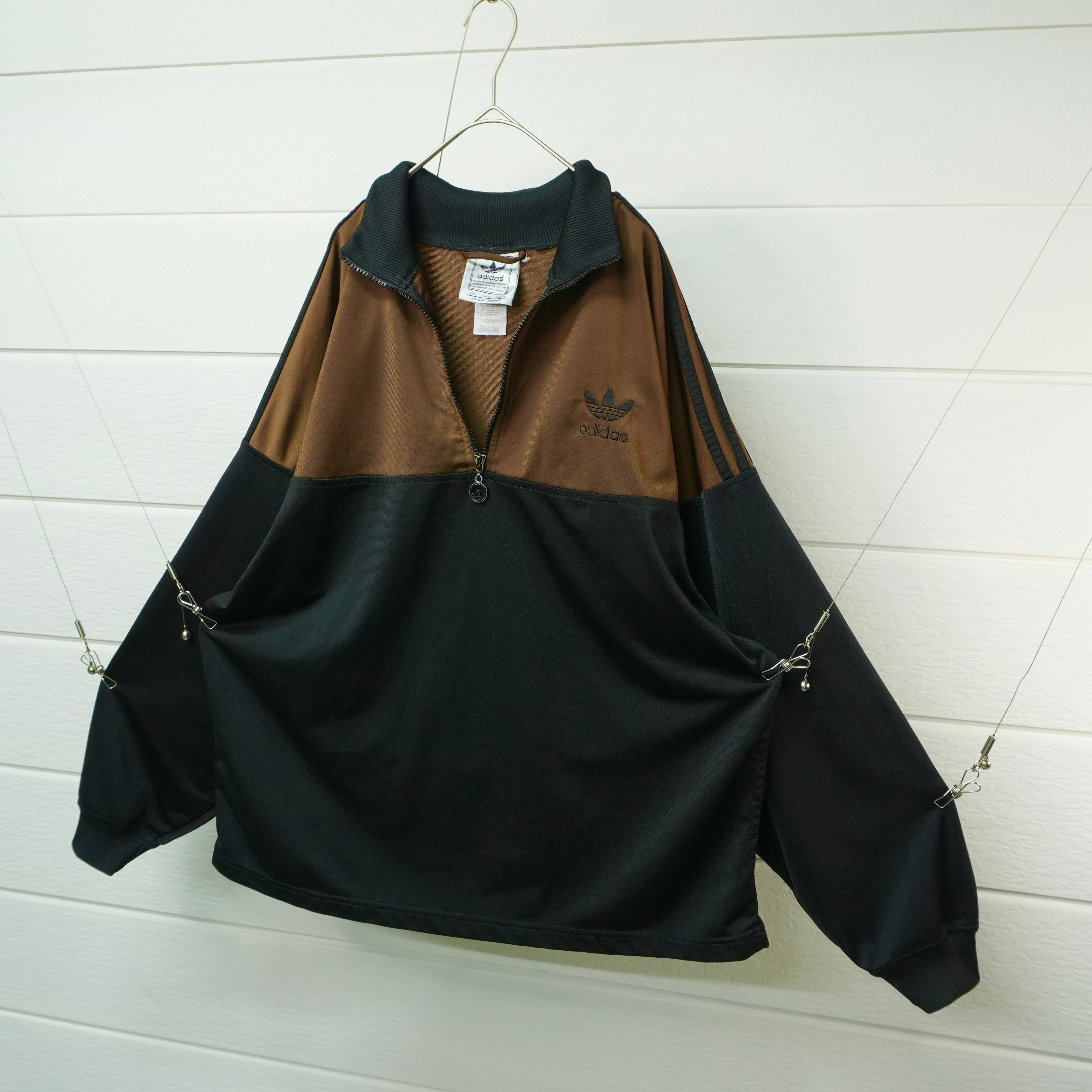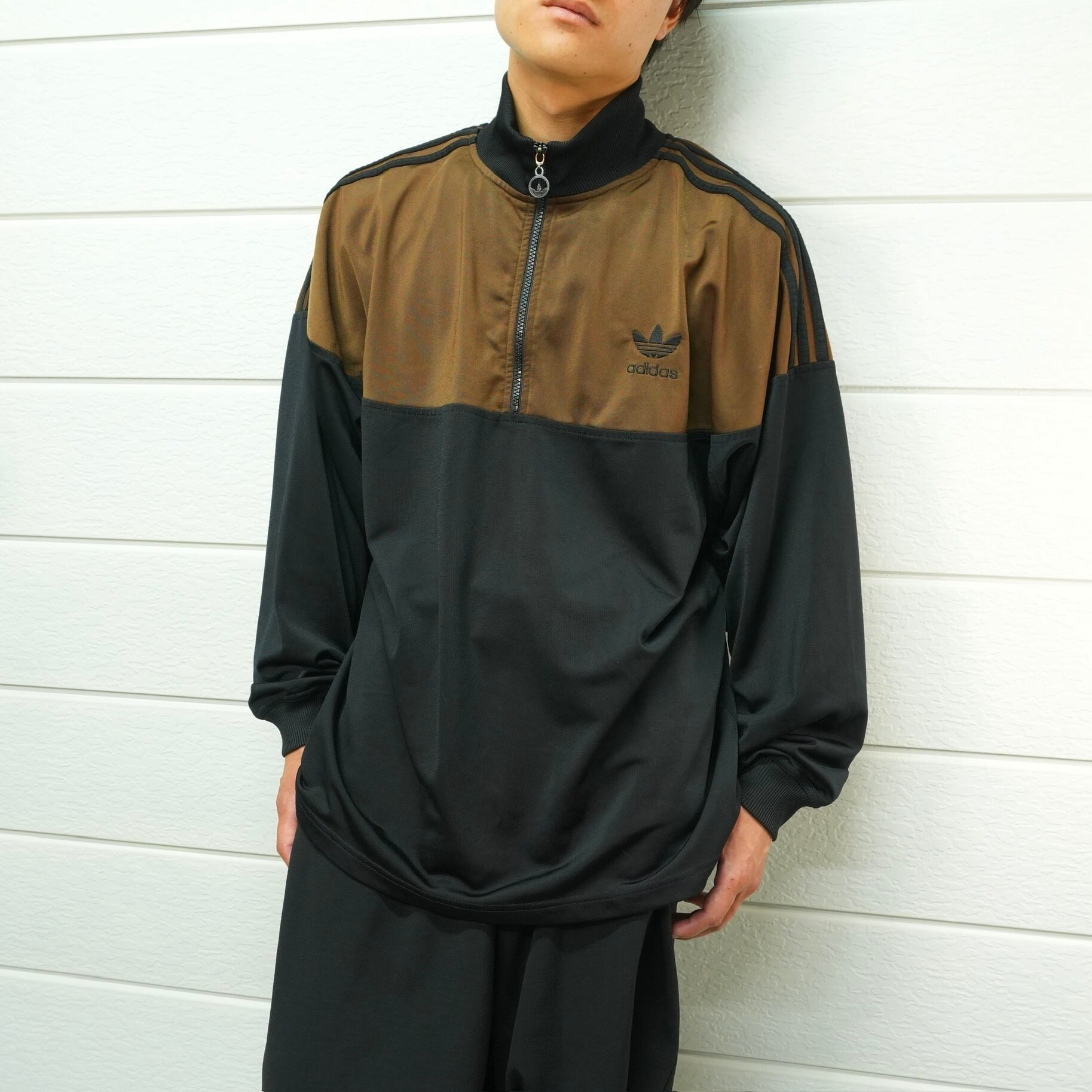 ダークブラウンとブラックの2トーンが存在感を放つ、アディダスハーフジップトラックジャケット.