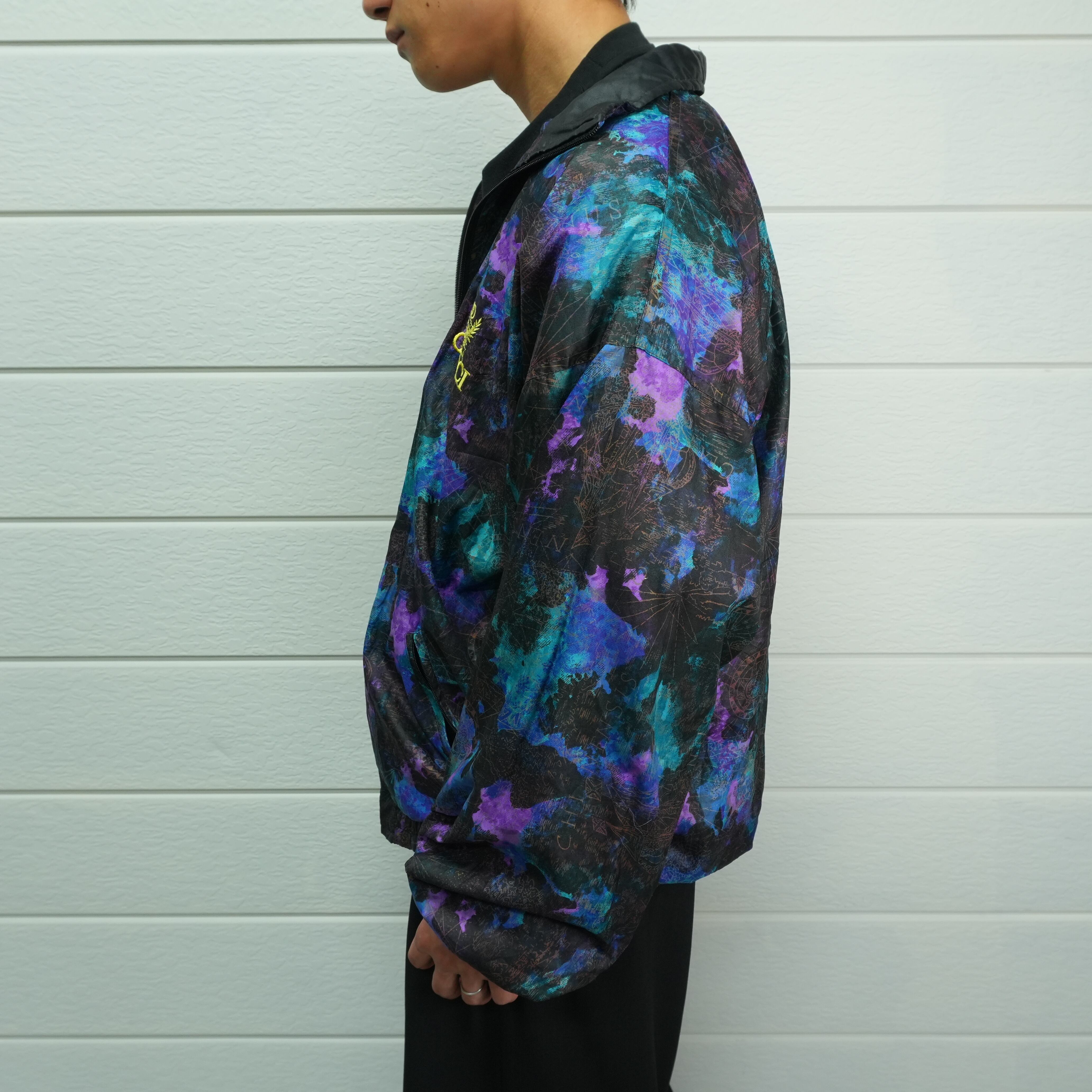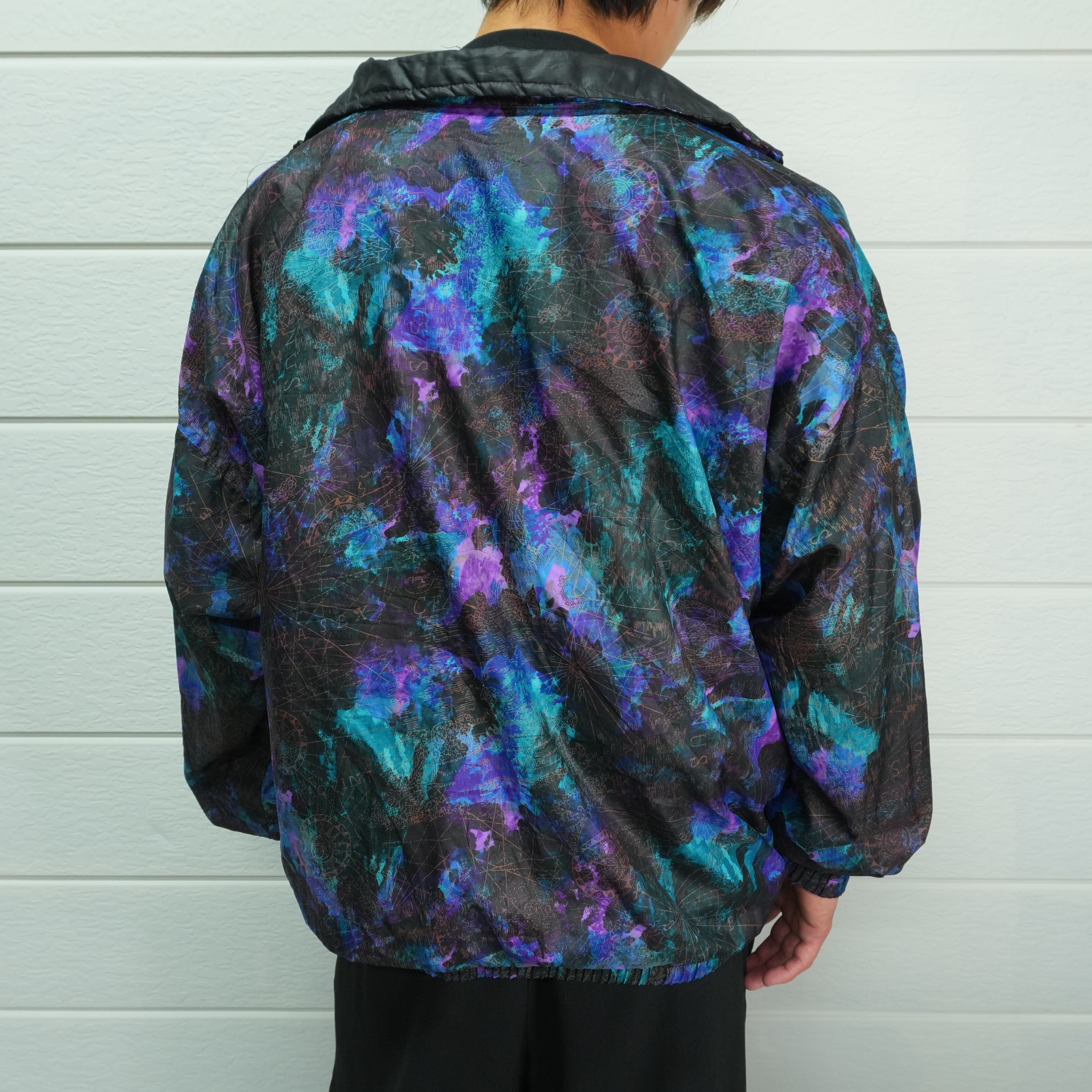 ブルー・パープル・ターコイズが良い感じに重なり合ったマーブル調のデザインが目を引くナイロンジャケット.