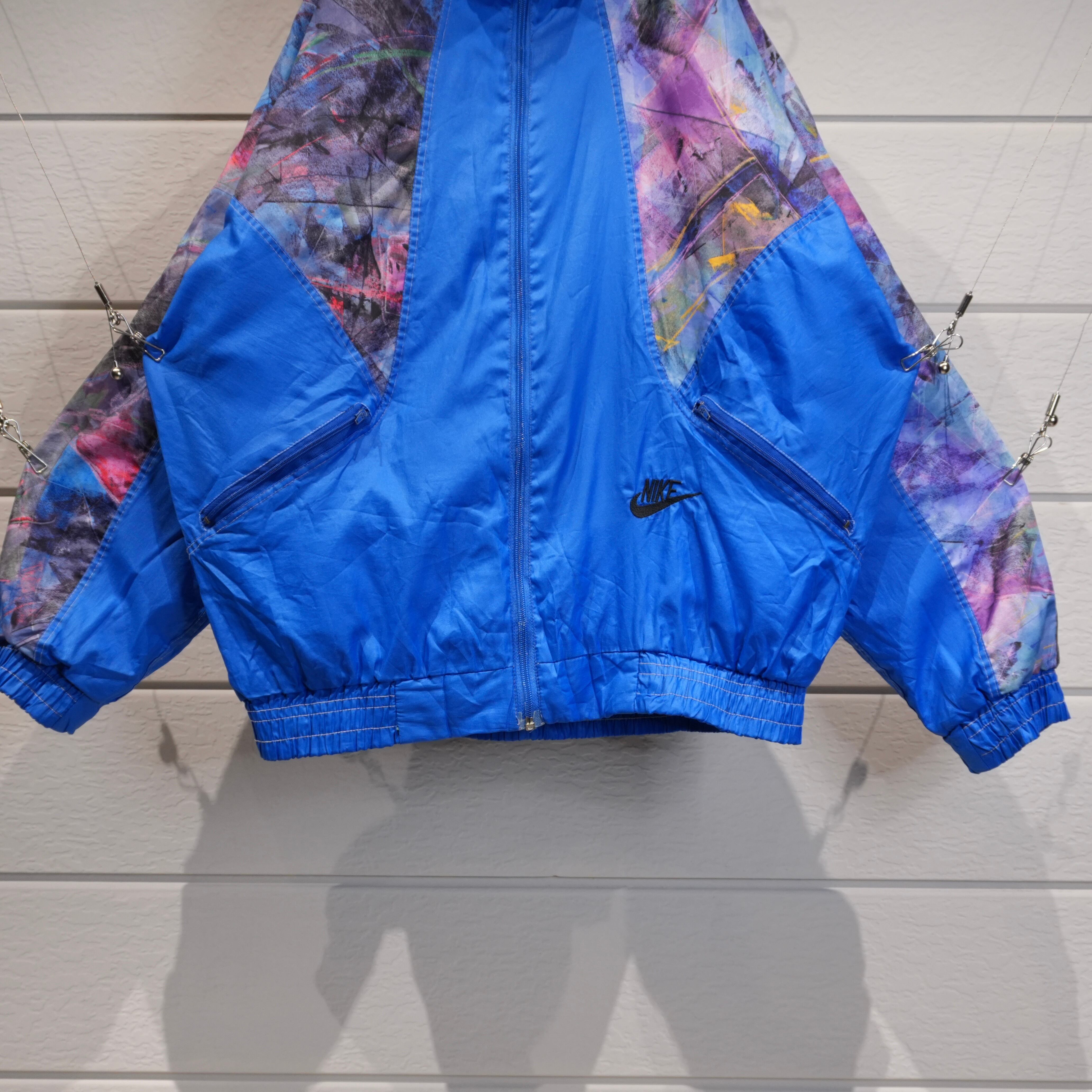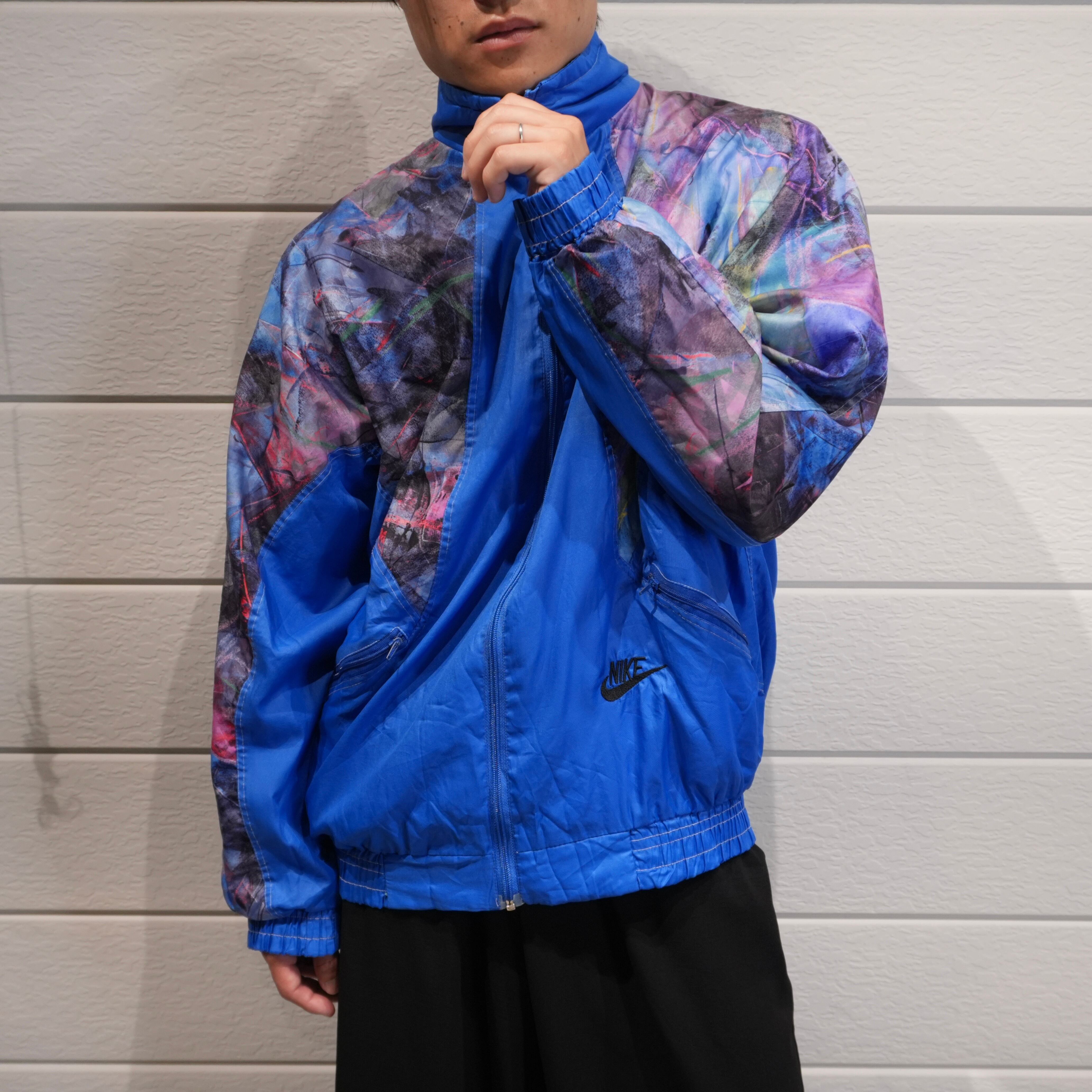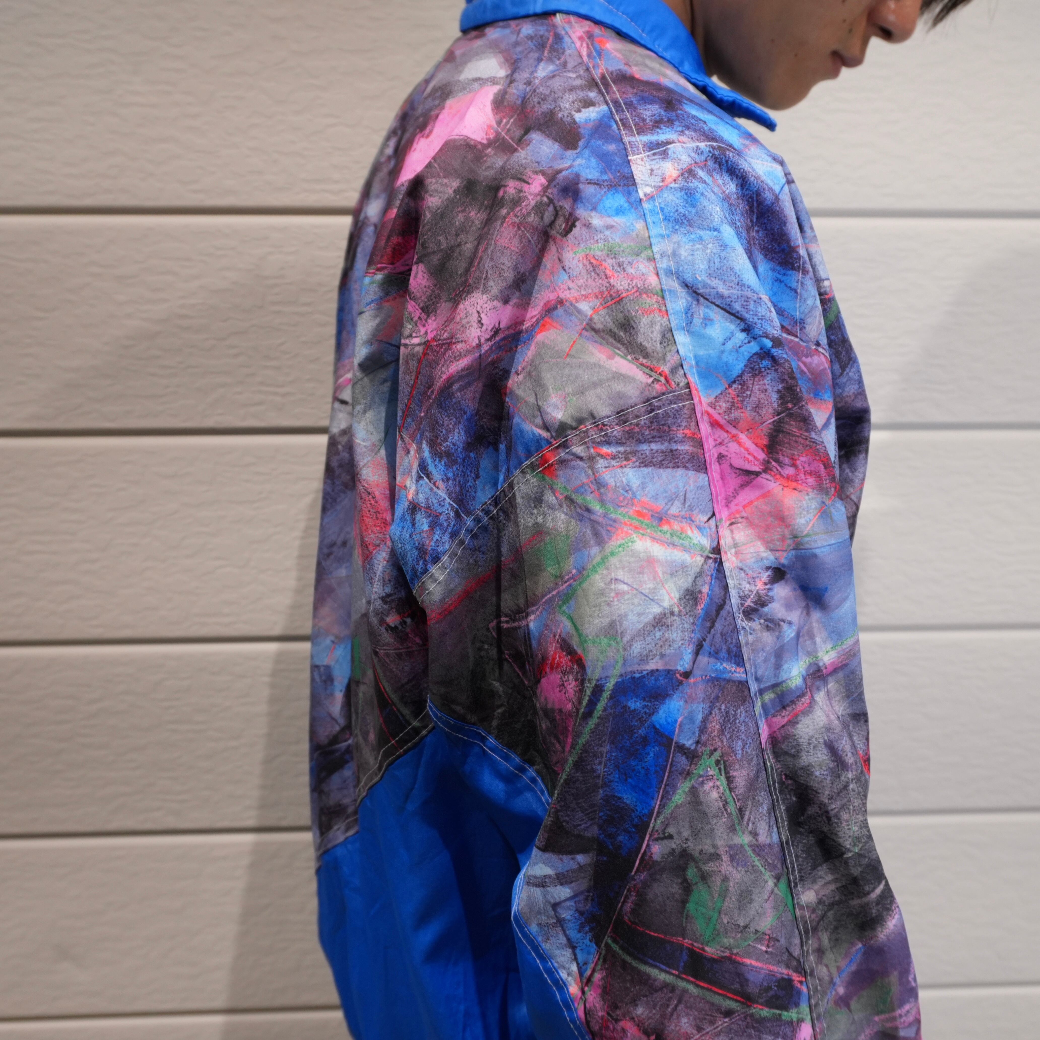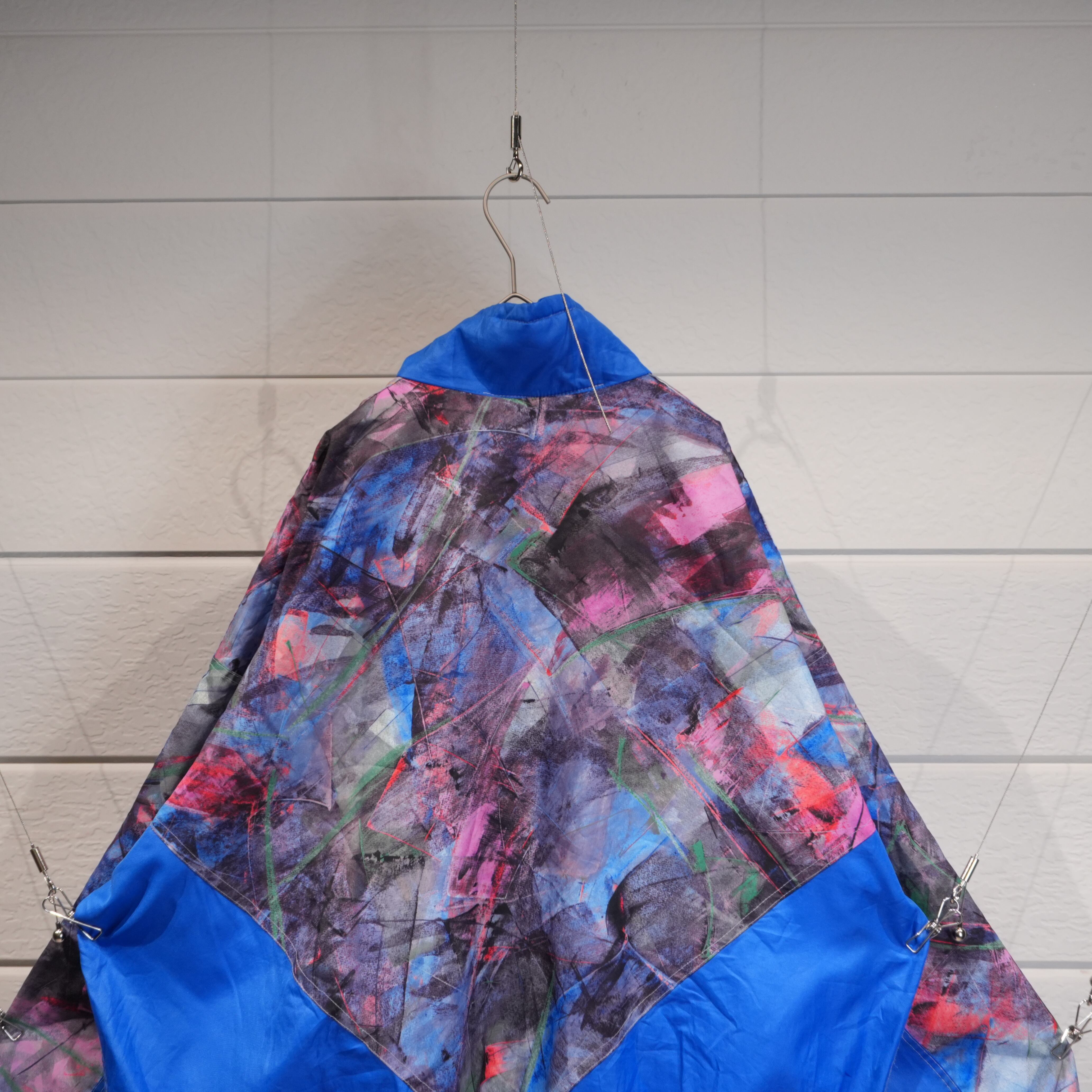 色鮮やかなブルーをメインにアートデザインのような総柄切り替えのナイロンジャケット.