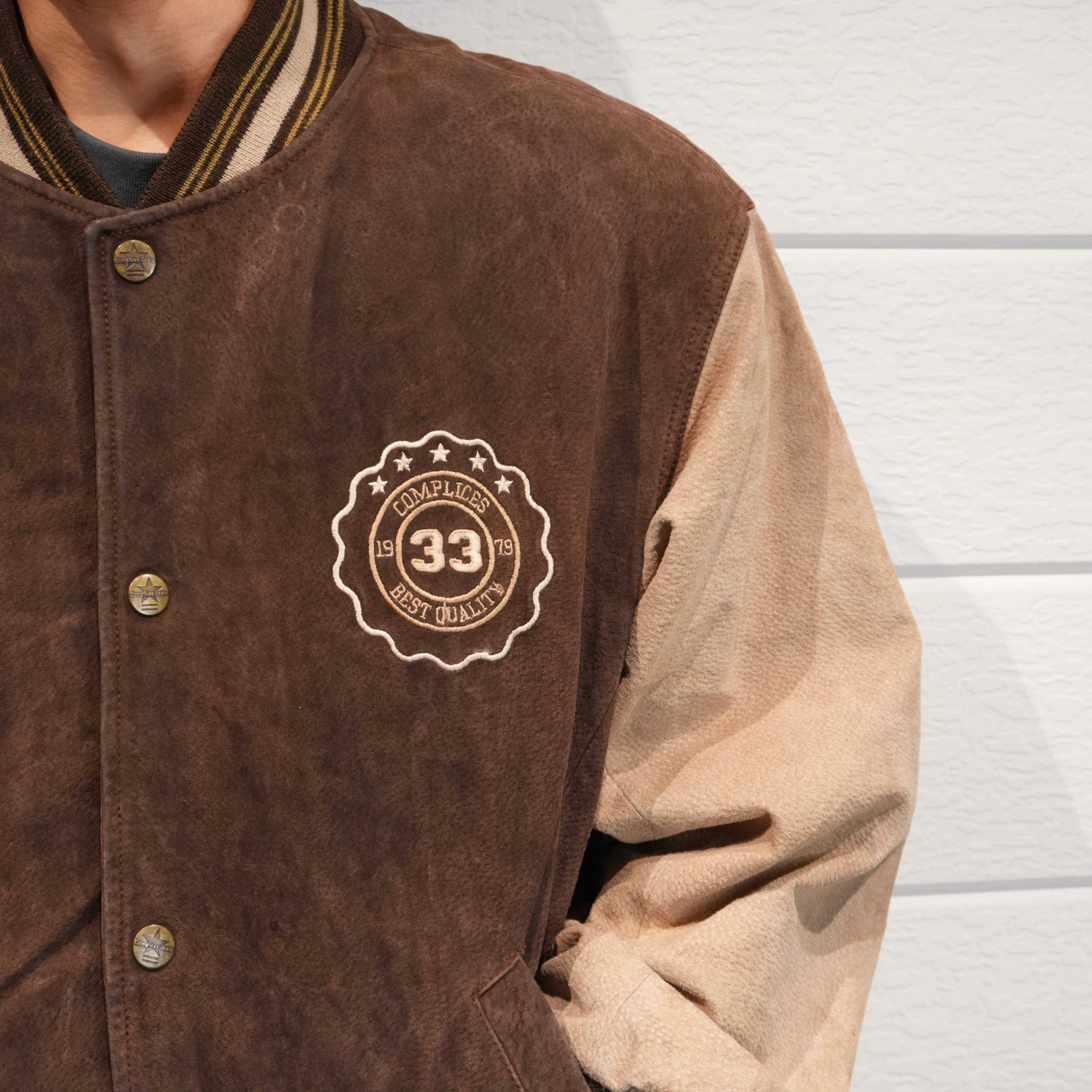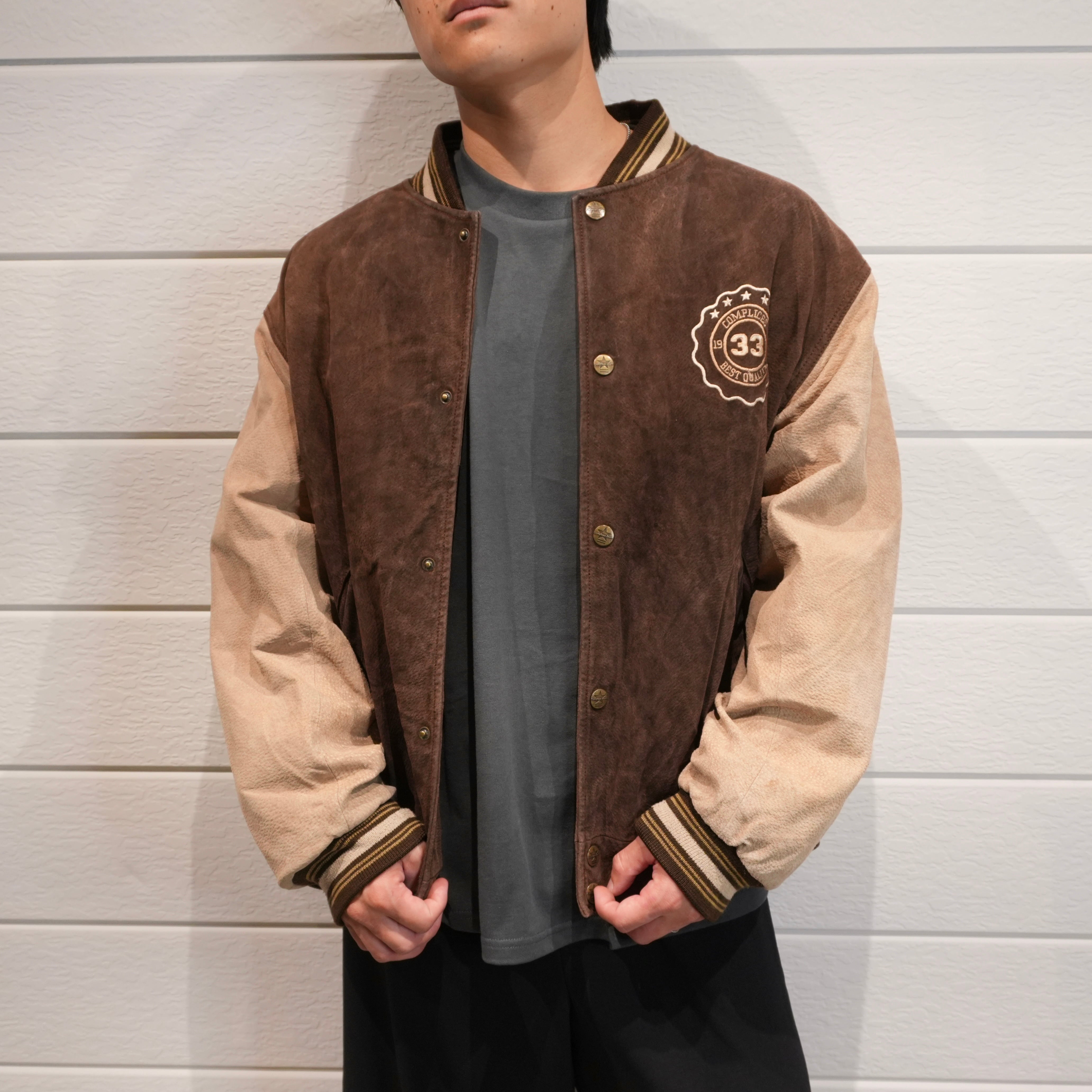 ブラウン×ベージュのツートーンが絶妙な存在感を放つヌバックレザースタジアムジャケット.