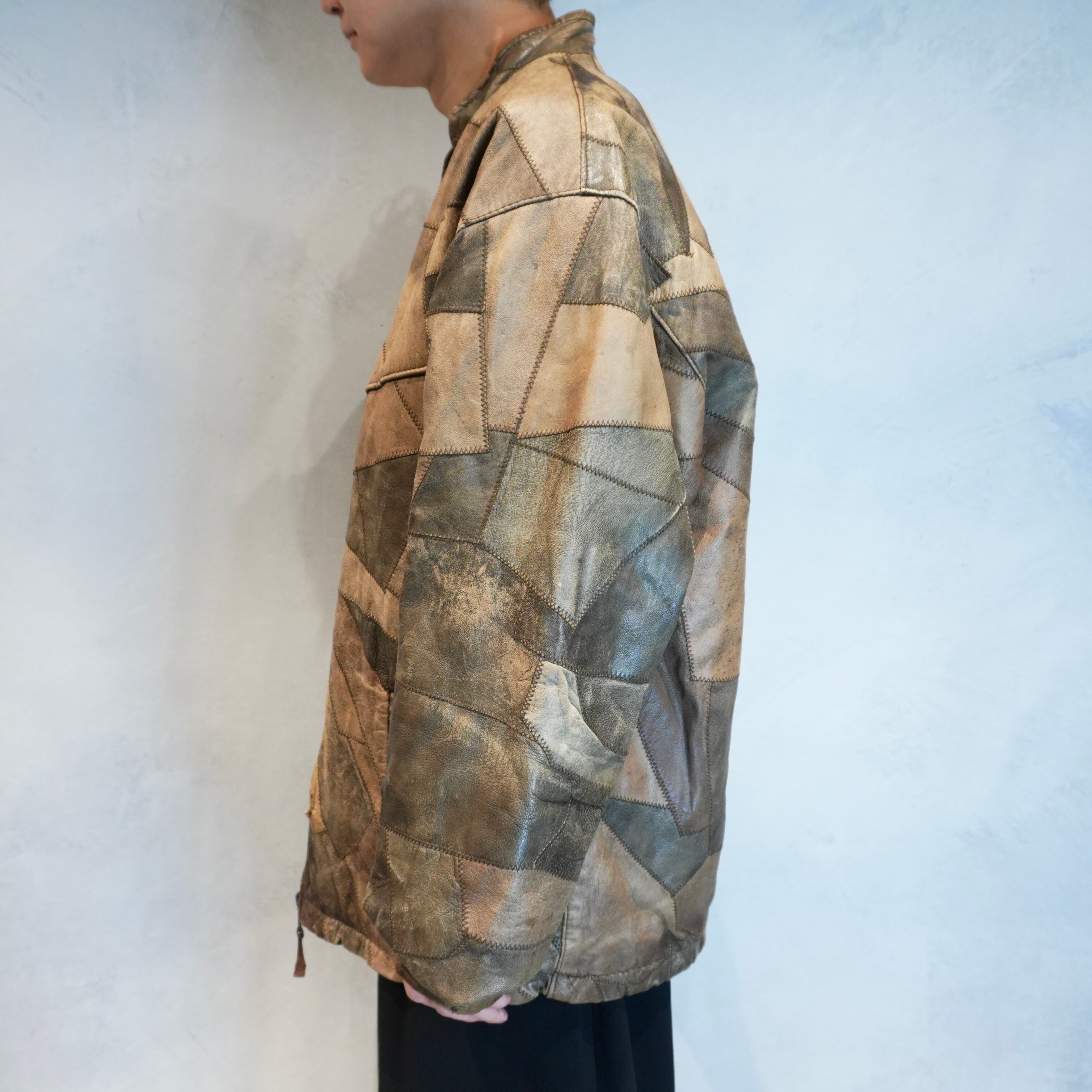 無骨な革の質感にランダムで構成されたパッチワークを大胆にデザインした存在感抜群の一着.