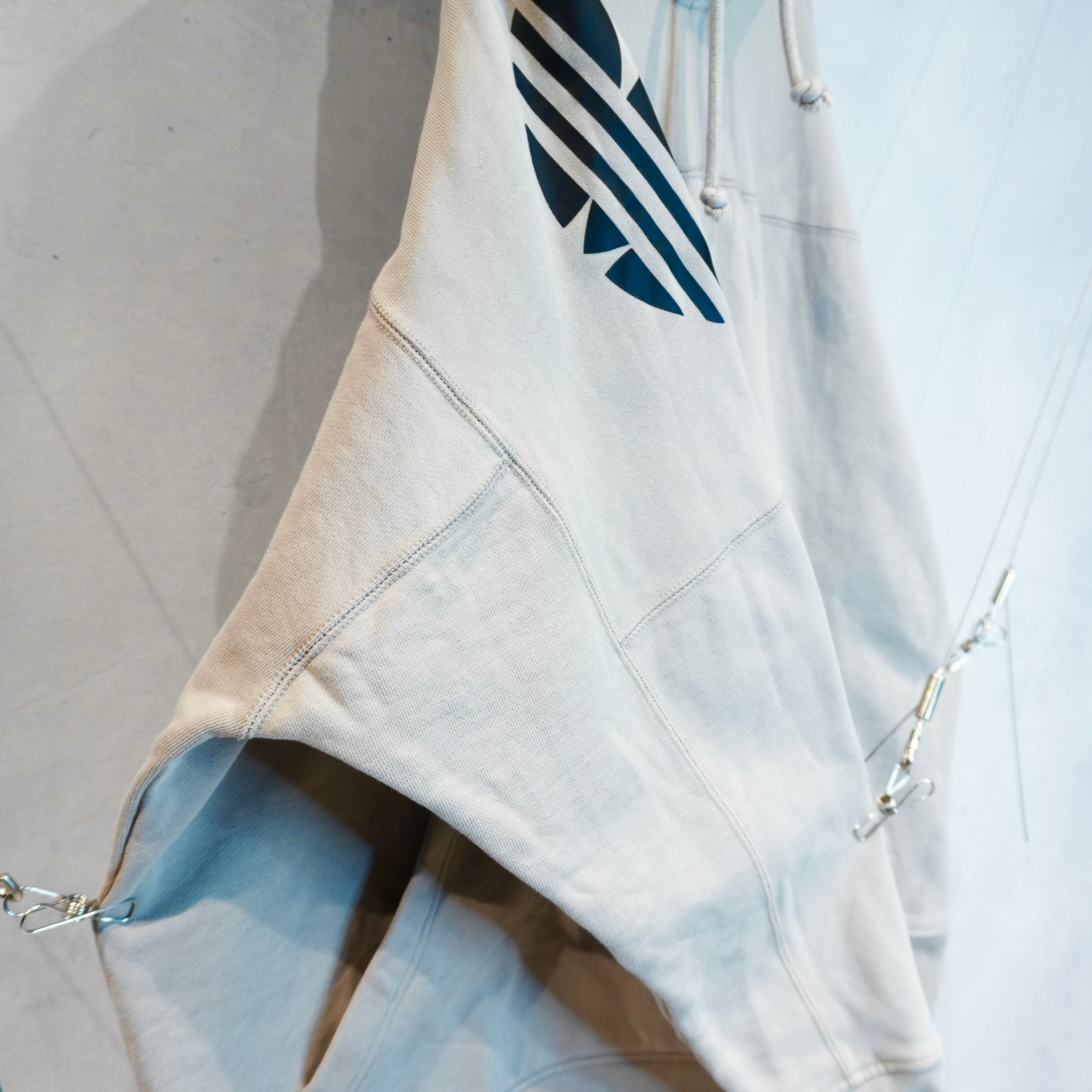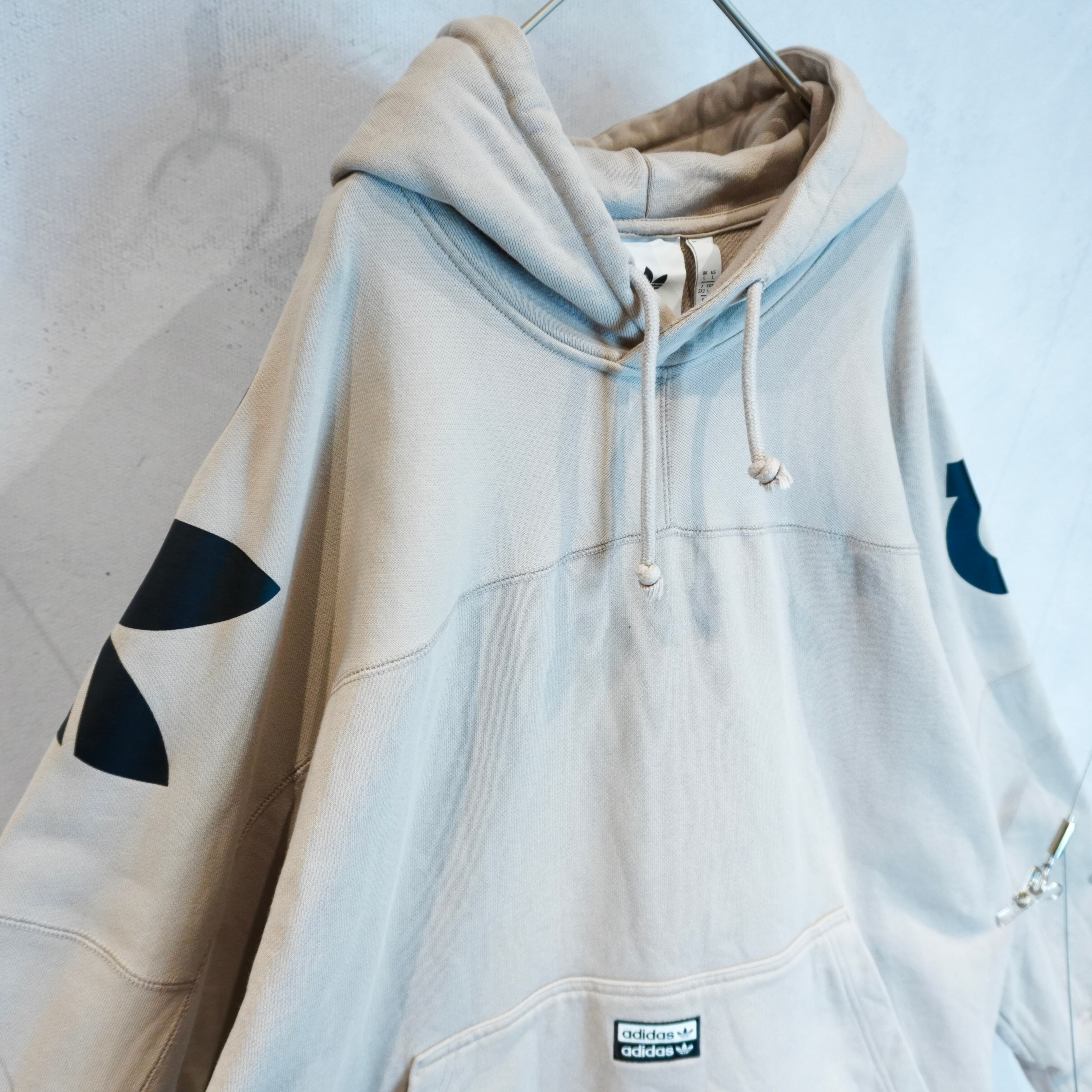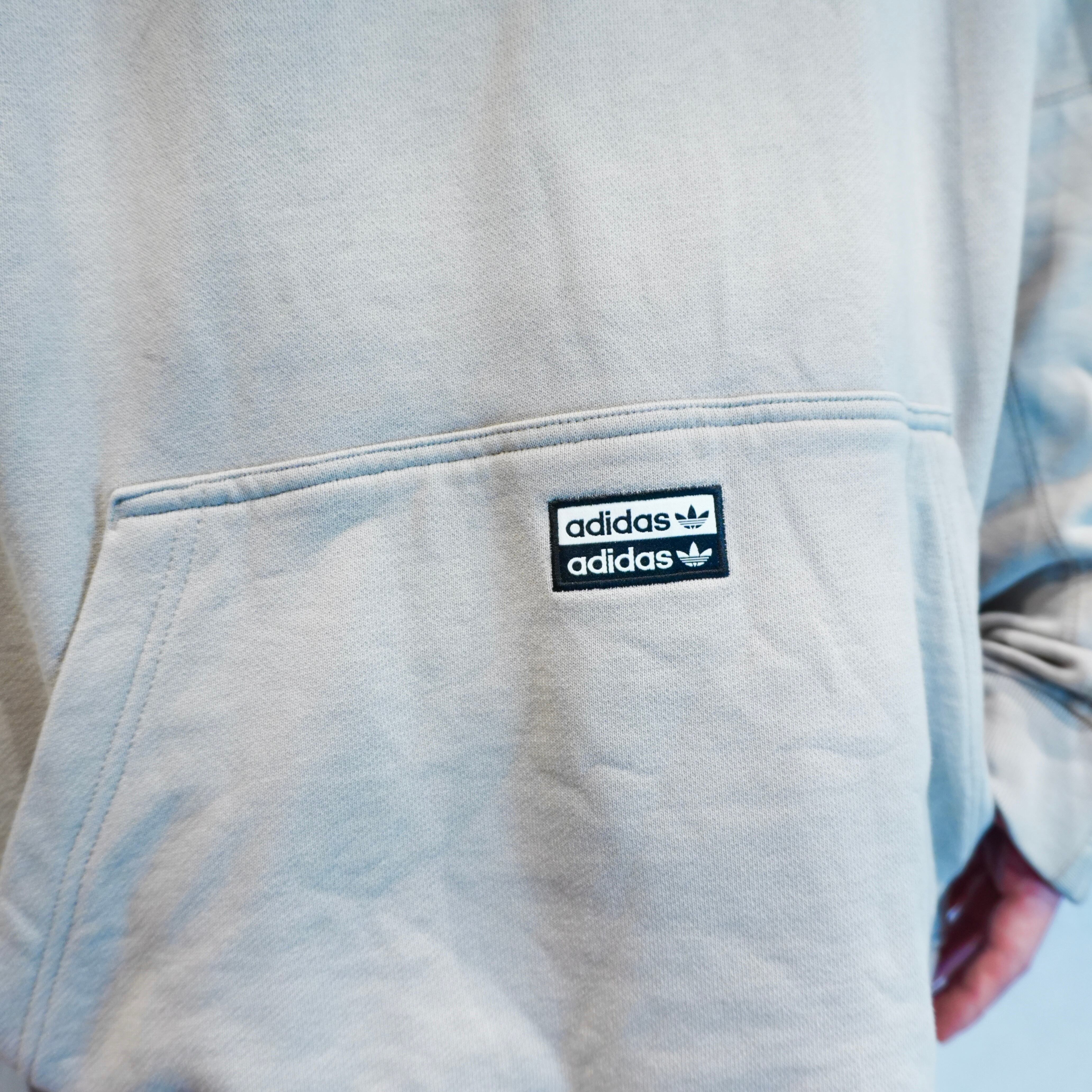 背中にぐるっと大きく入ったアーチロゴがアイコニックなadidasのパーカープルオーバー.