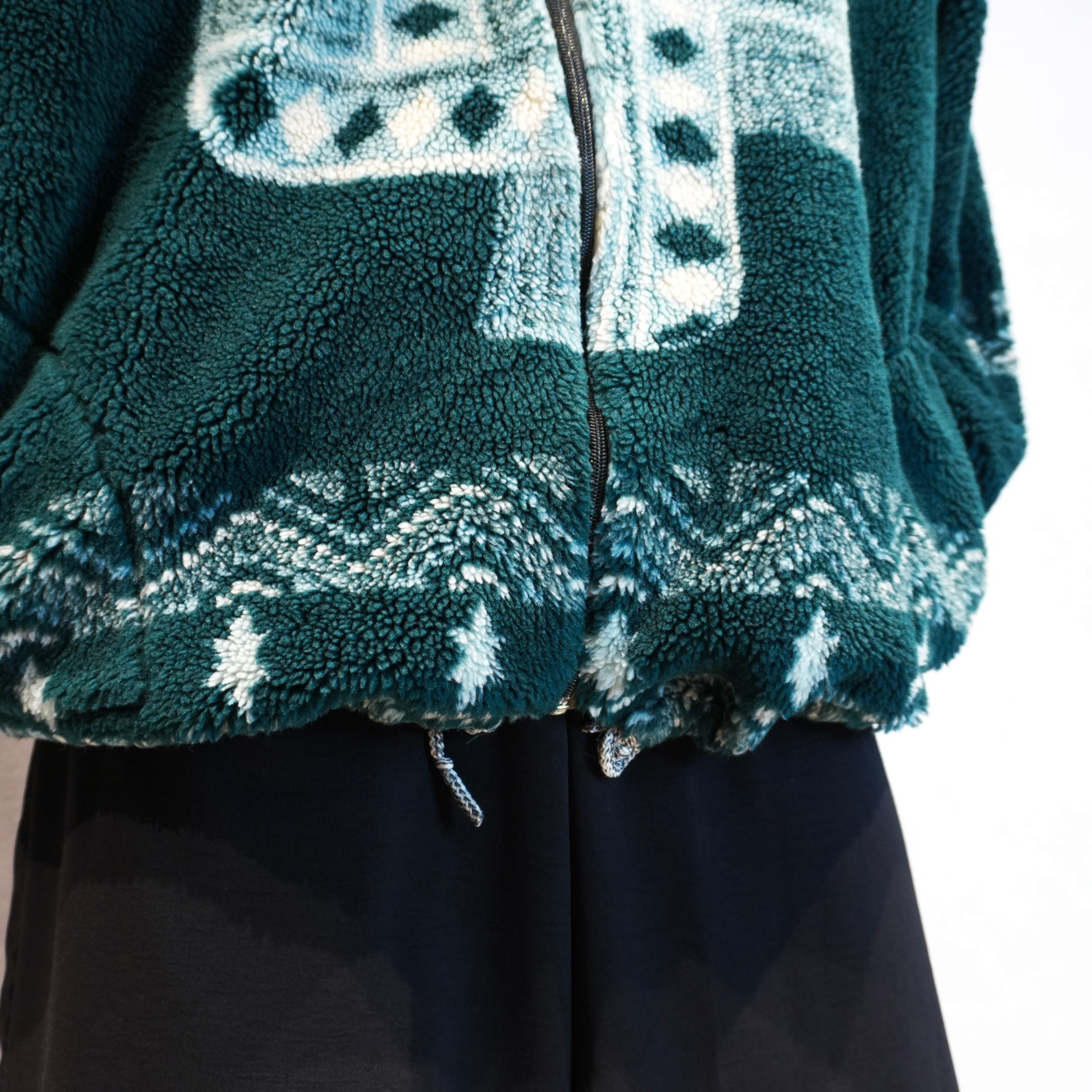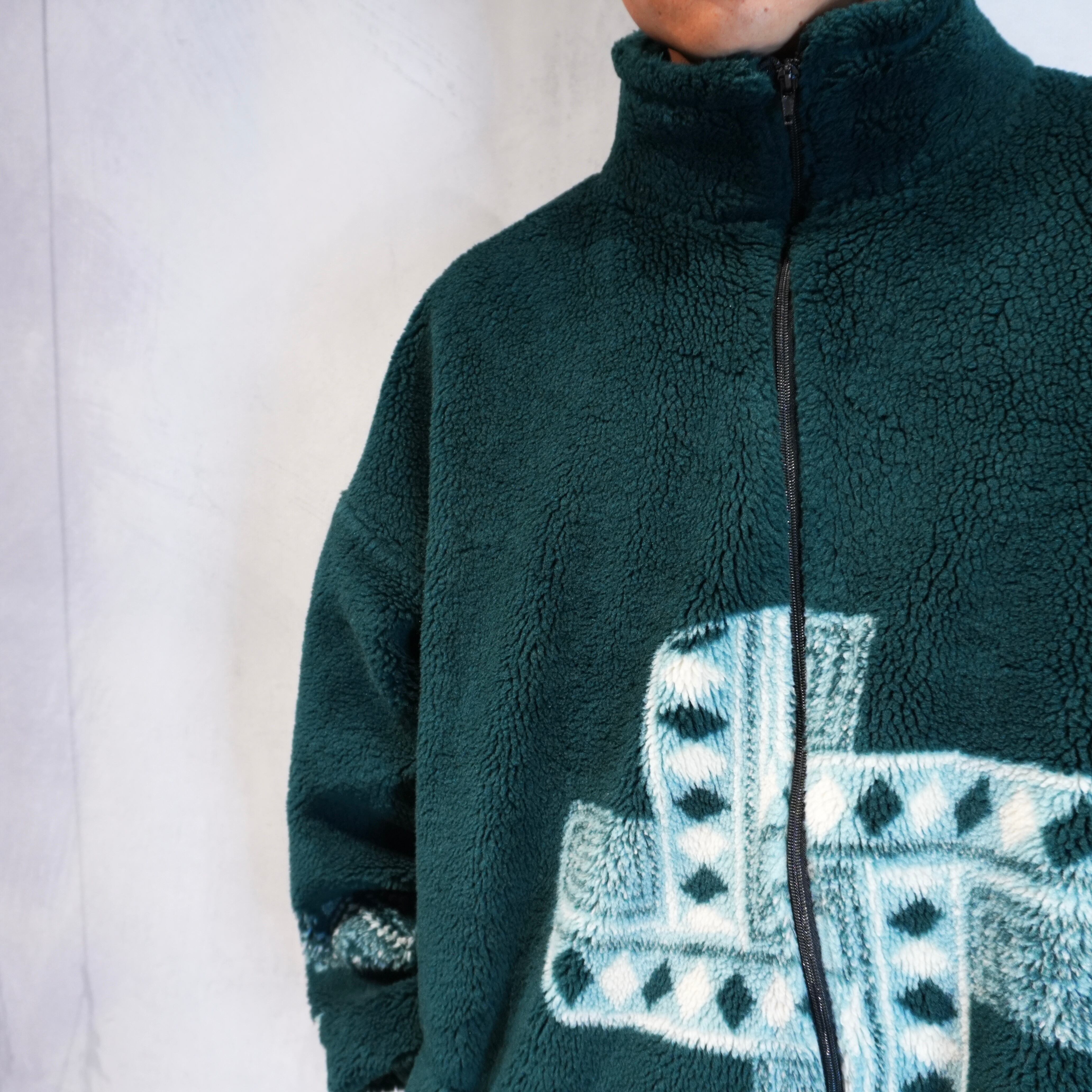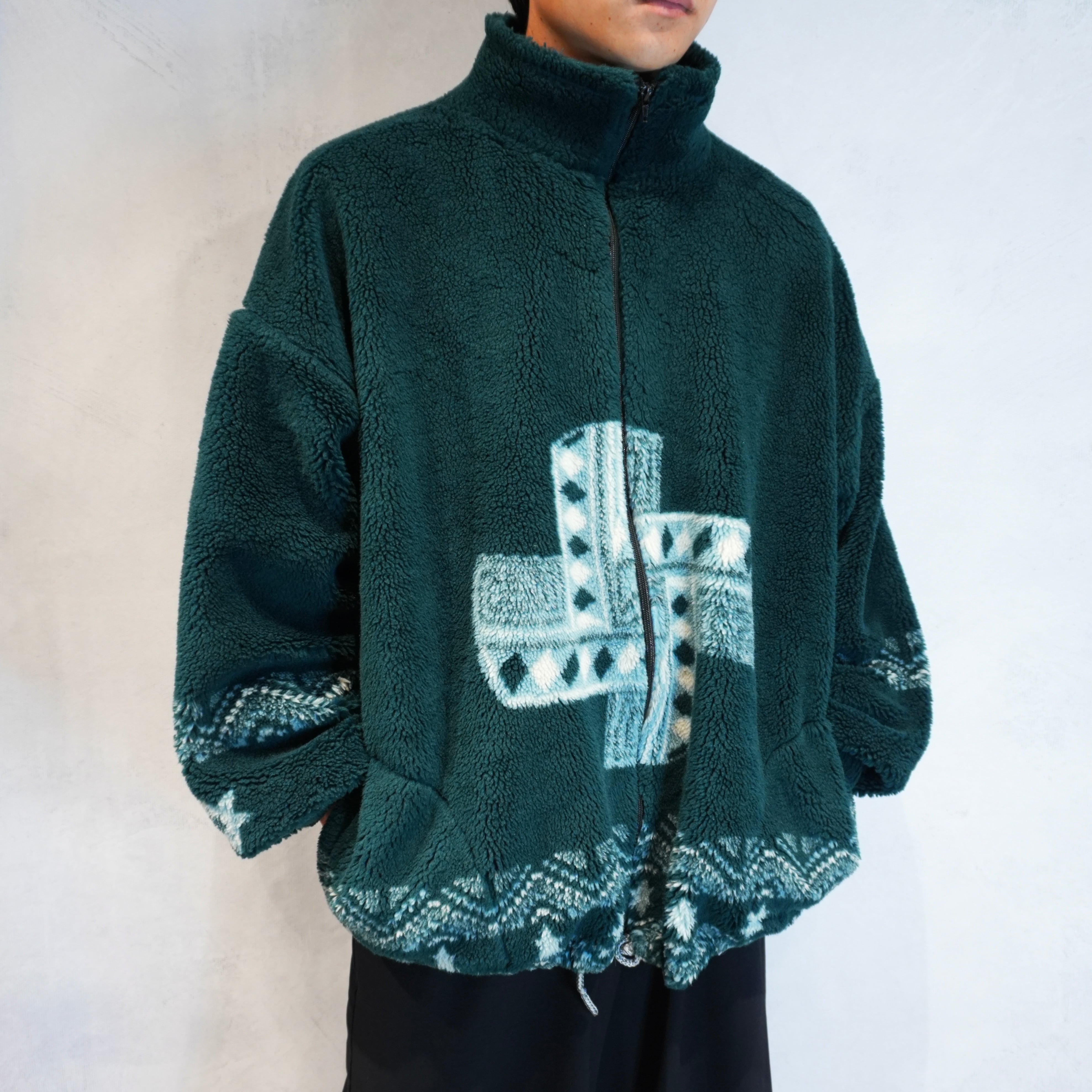 深みのあるダークグリーンとネイティブ柄が冬コーデに映えるフリースジャケット.
