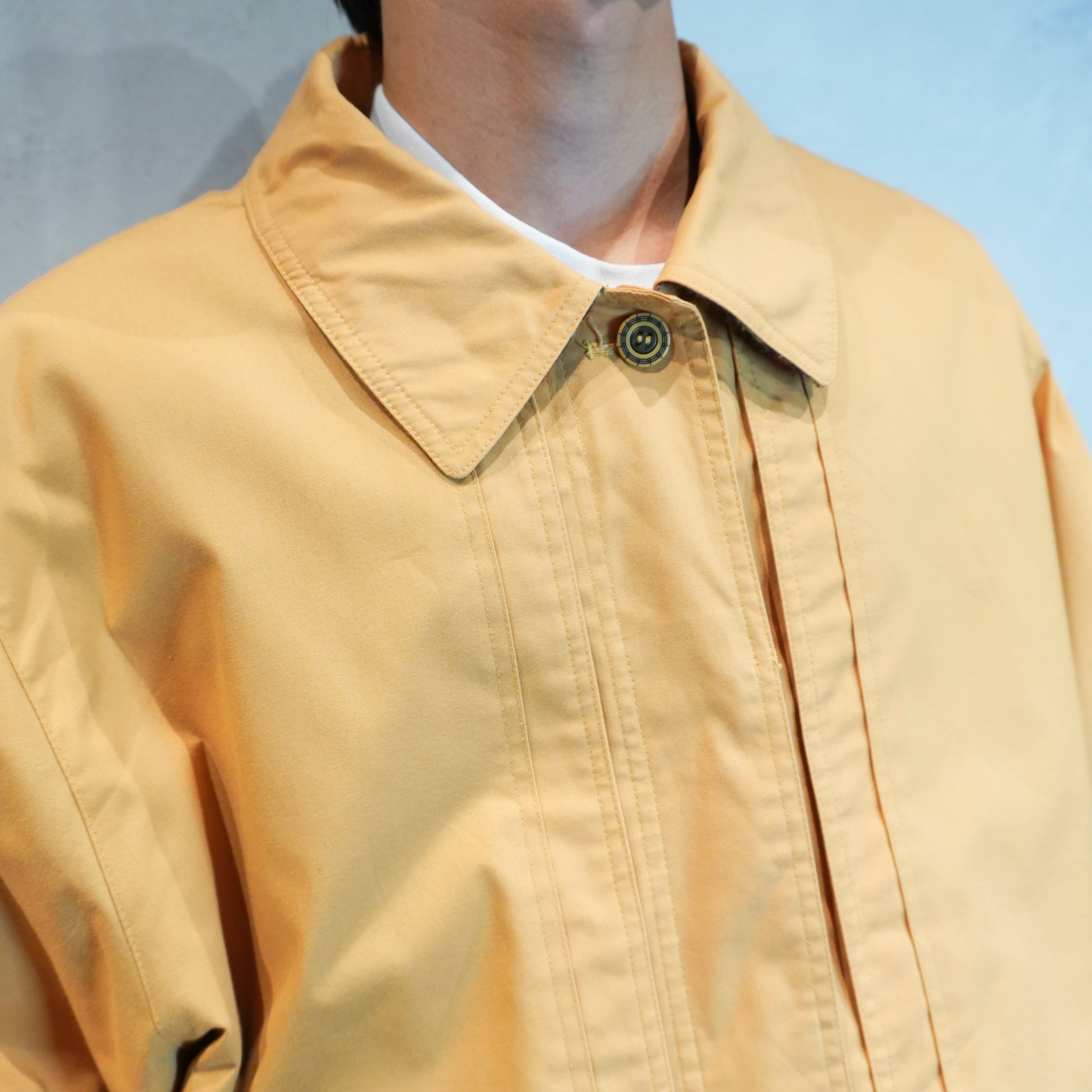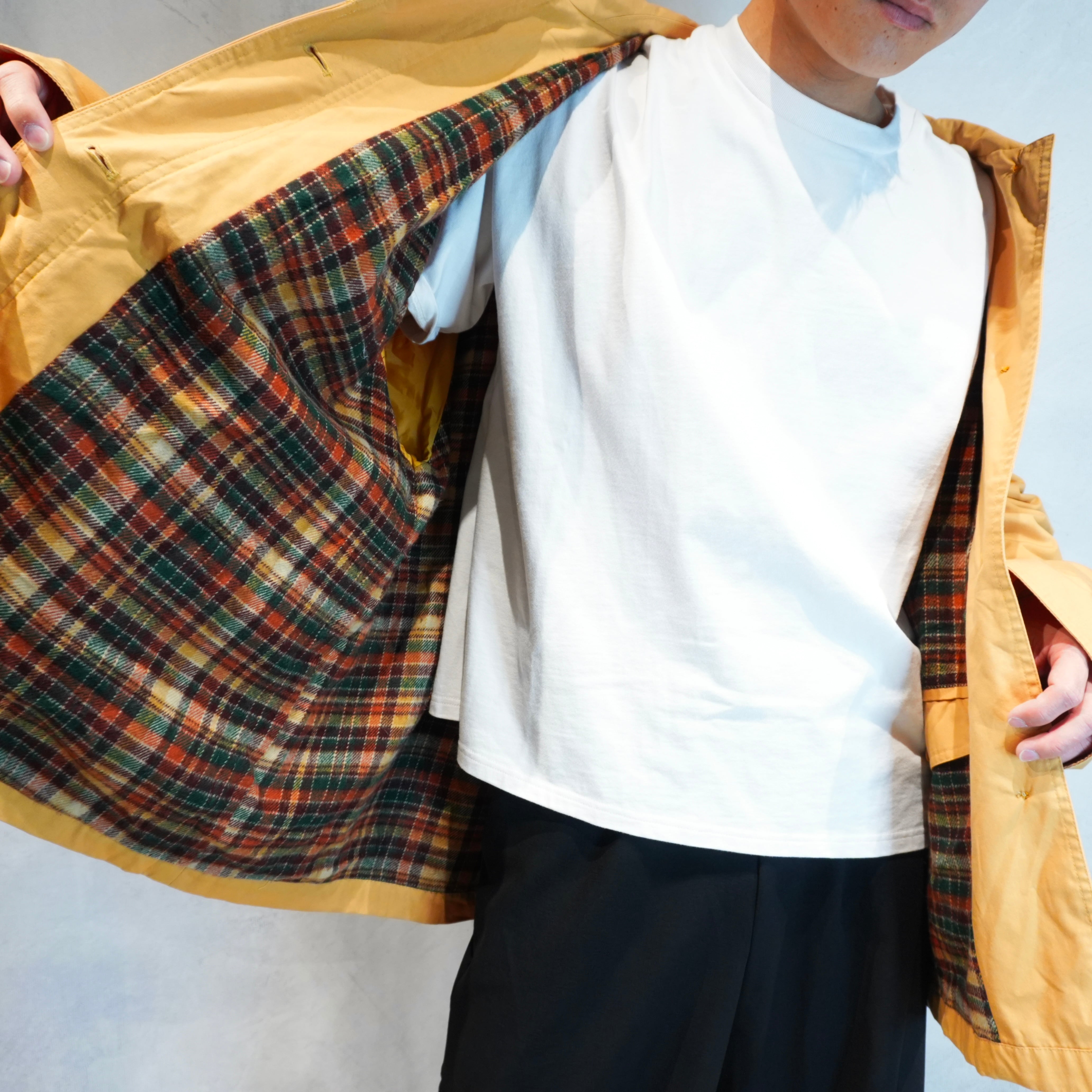 からし色のボディに裏地がクラシックなチェック柄のジャケット.