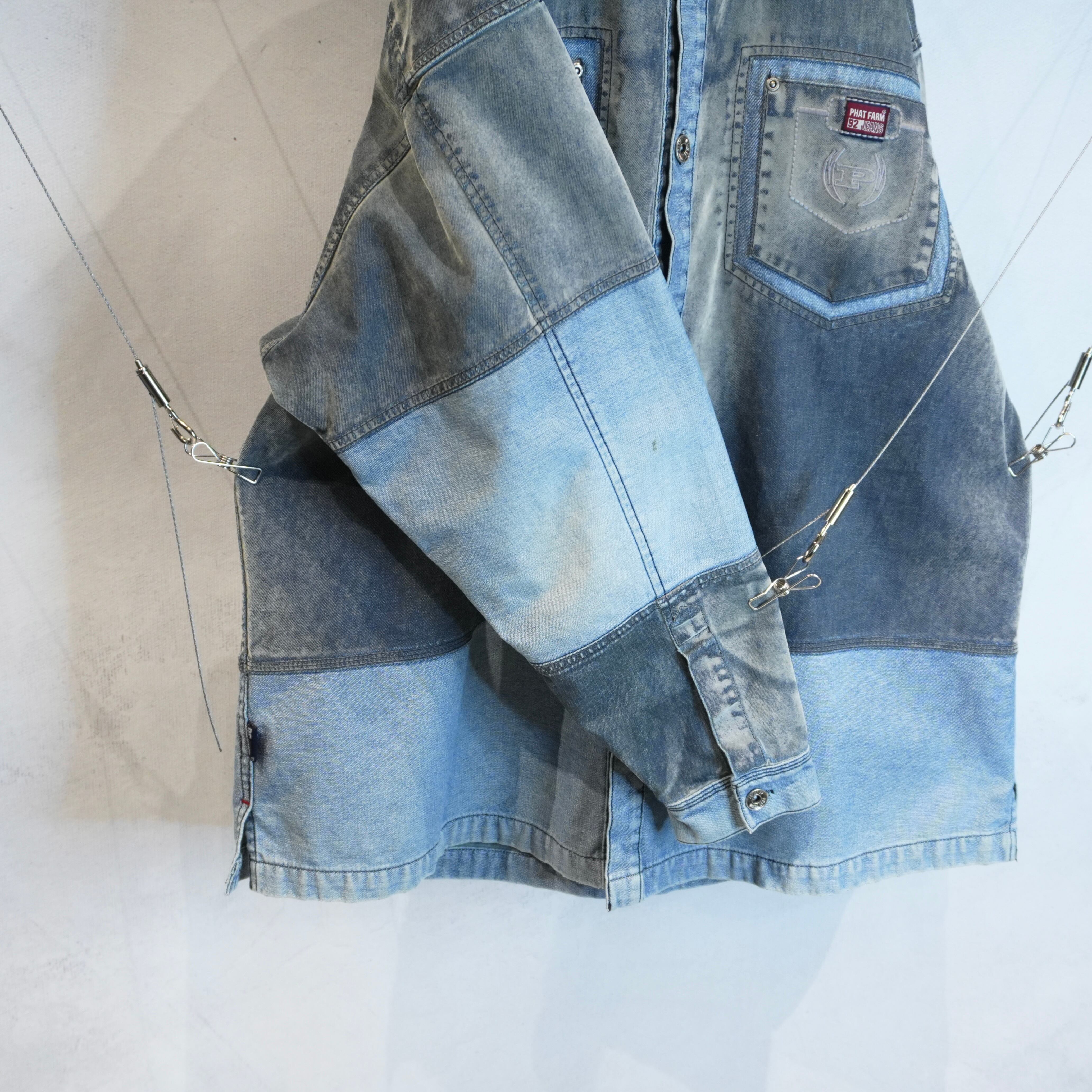 インディゴカラーでも異なるトーンのデニムを組み合わせた存在感のある一枚で、色落ちや表情の違いも古着ならではの一着です.