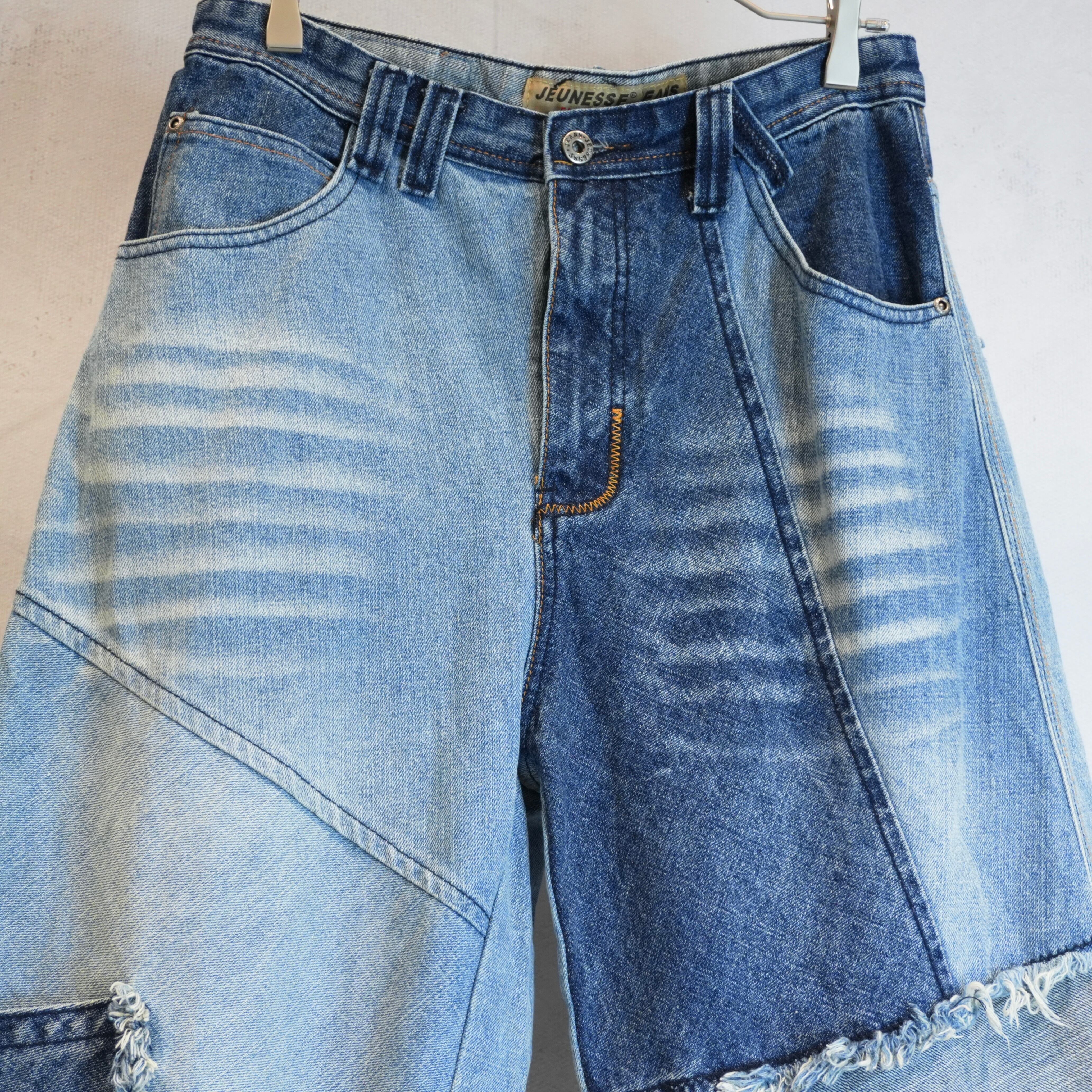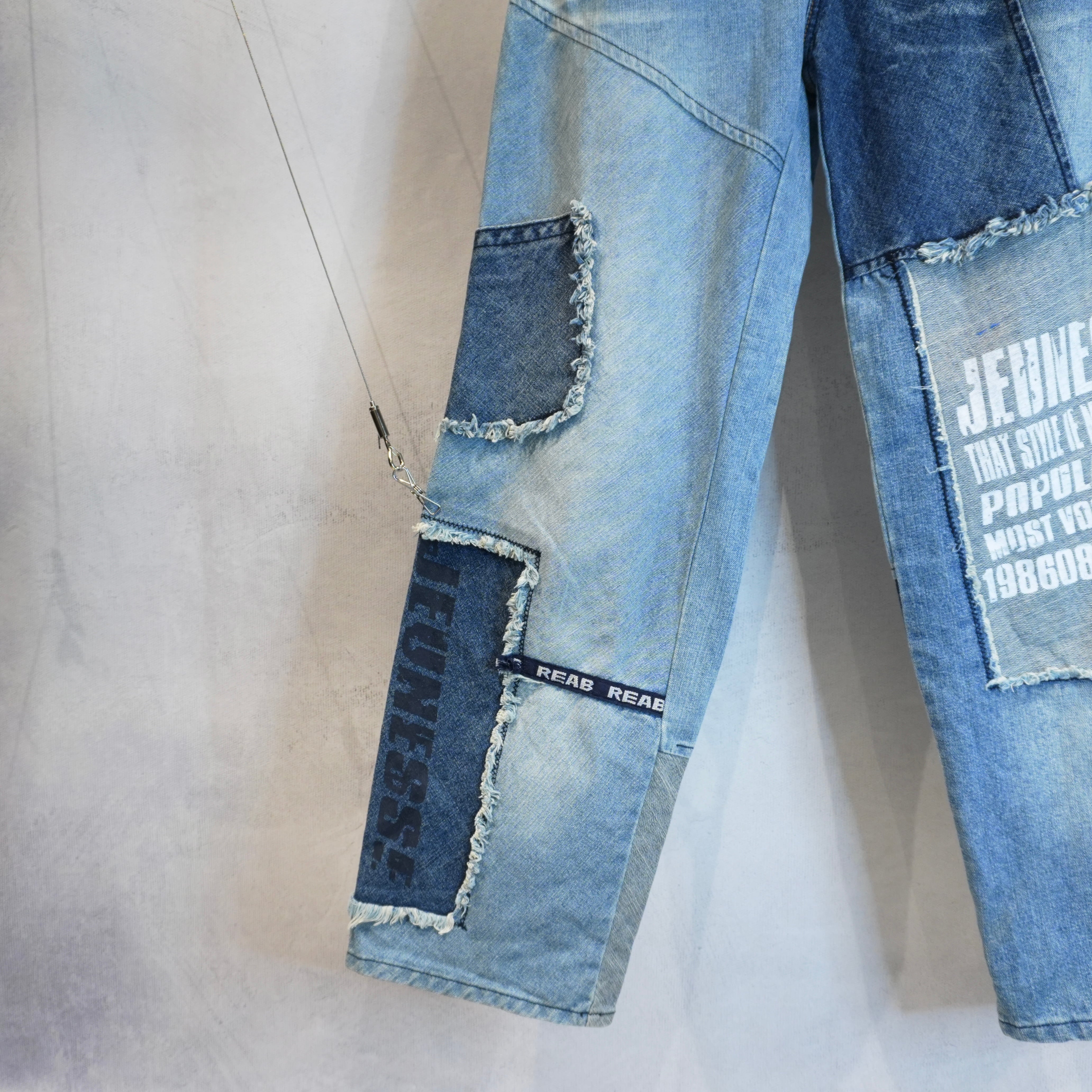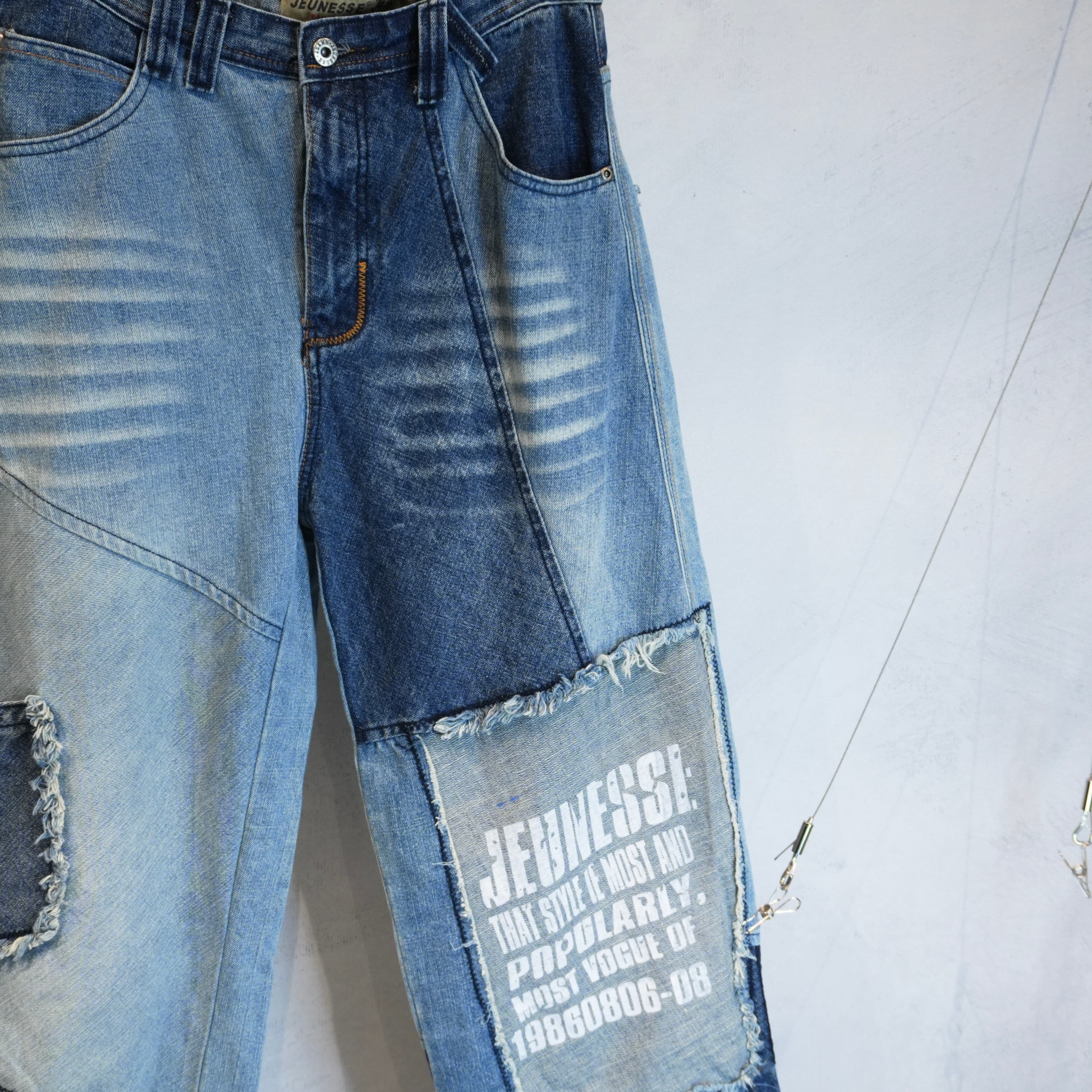 異なる表情のデニムを重ね、切り合わせたアーティスティックなデニムパンツ.