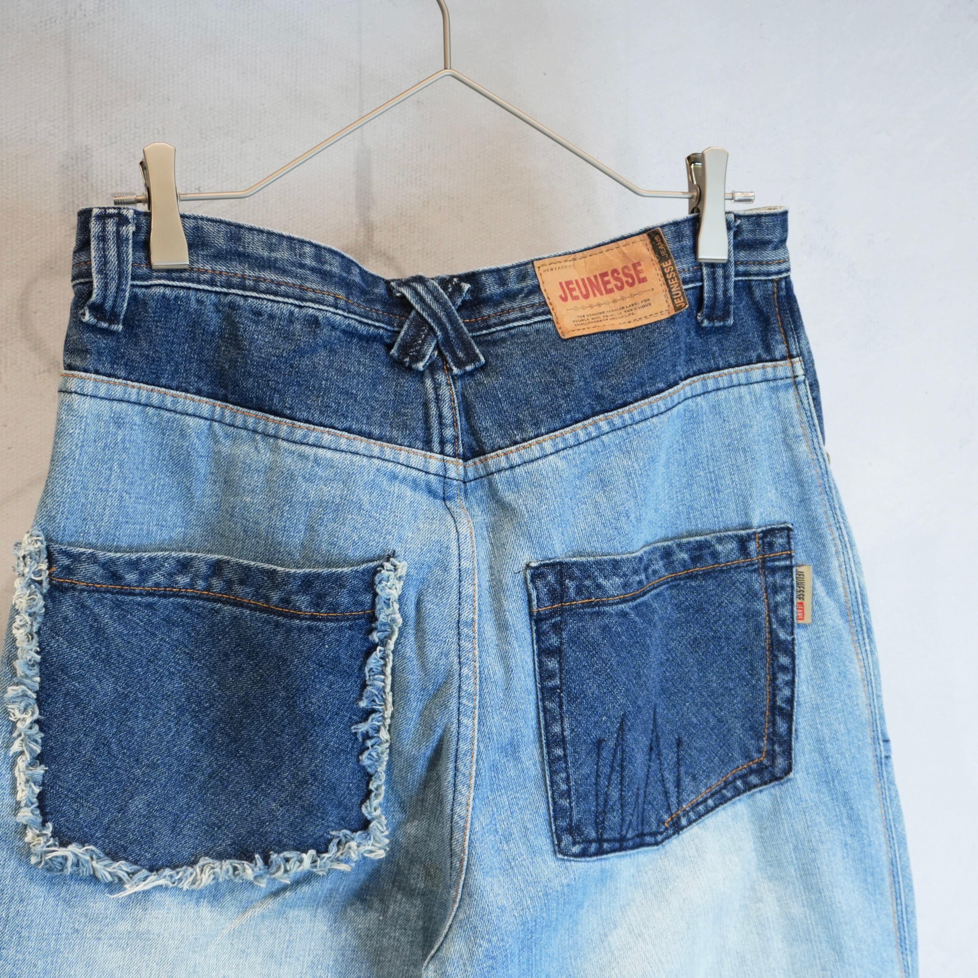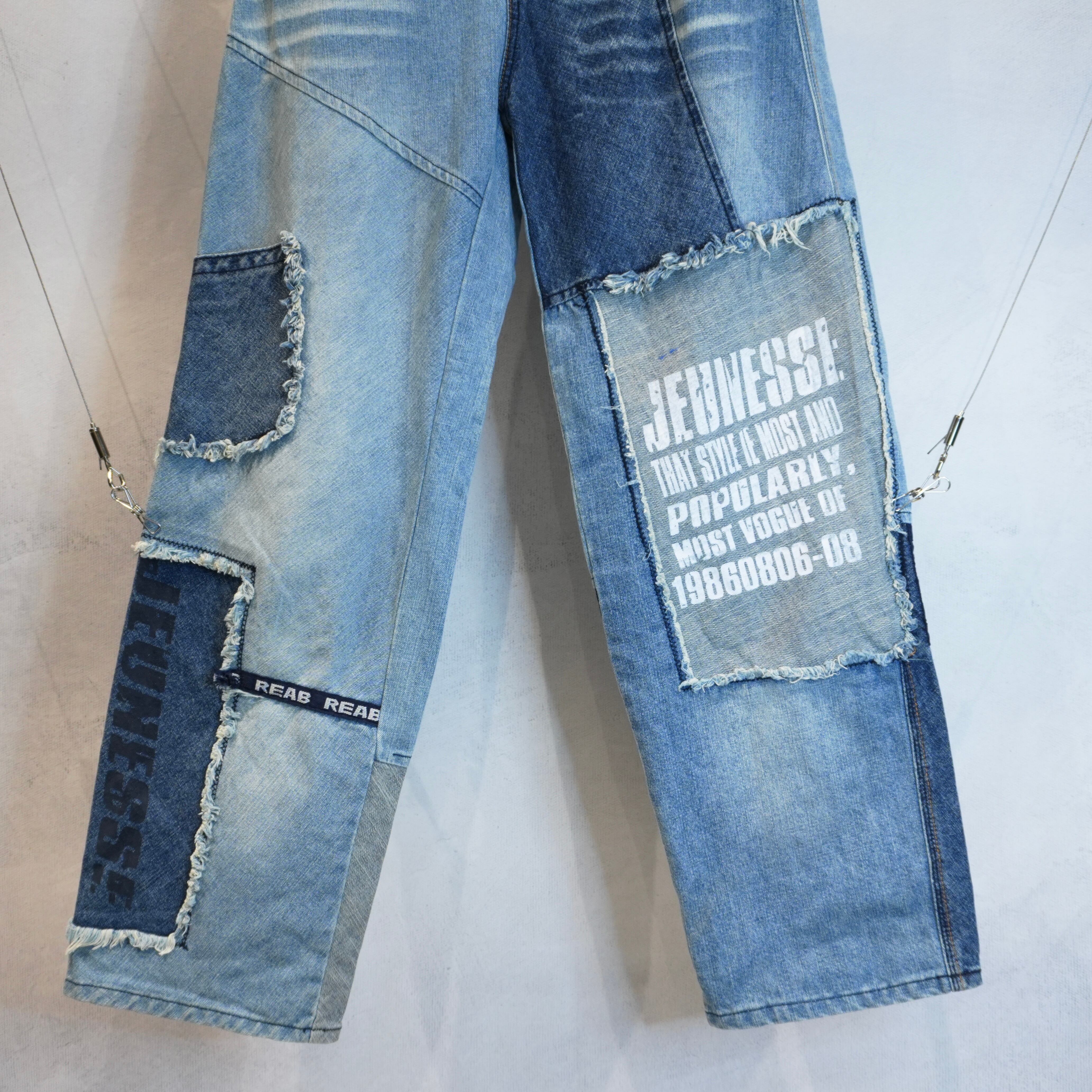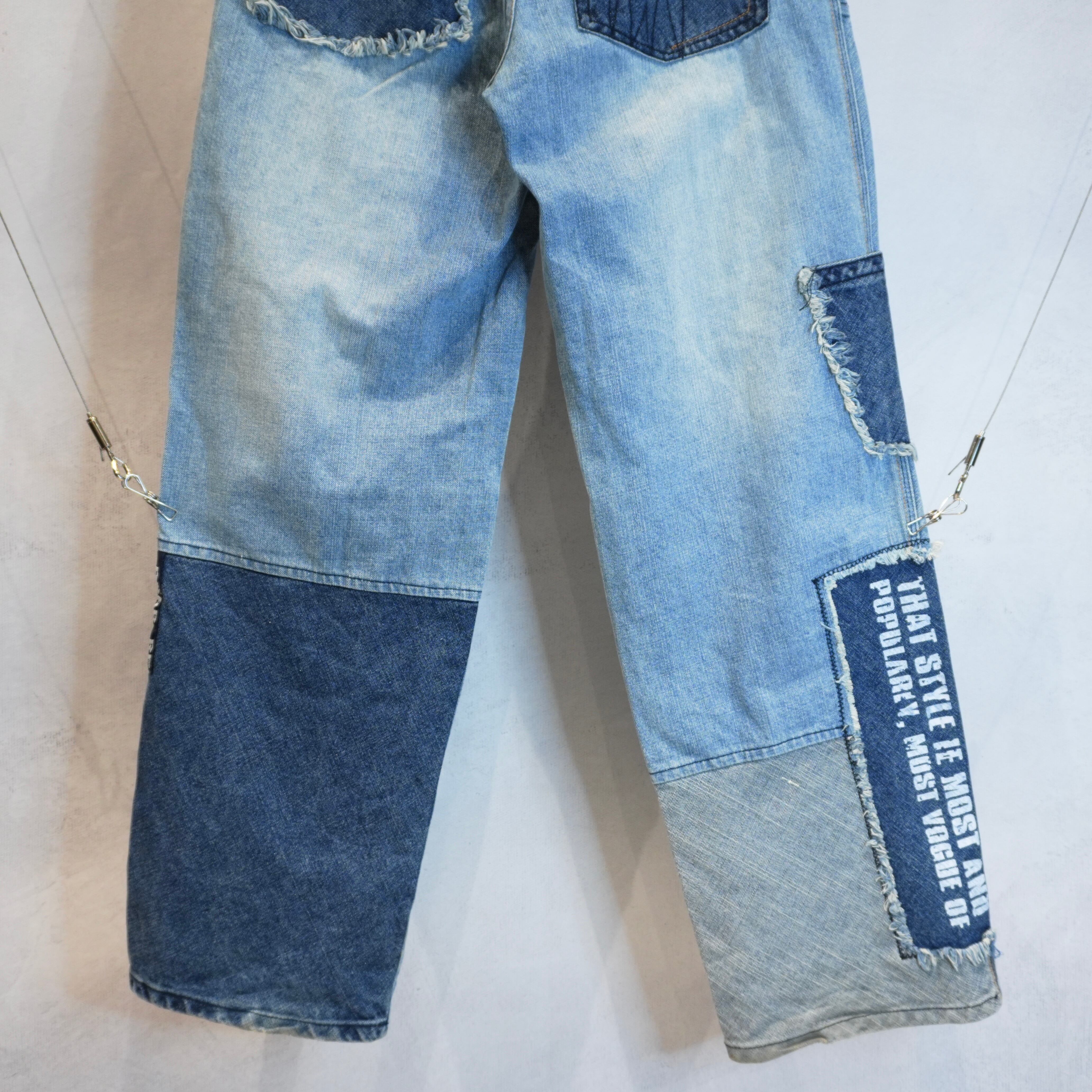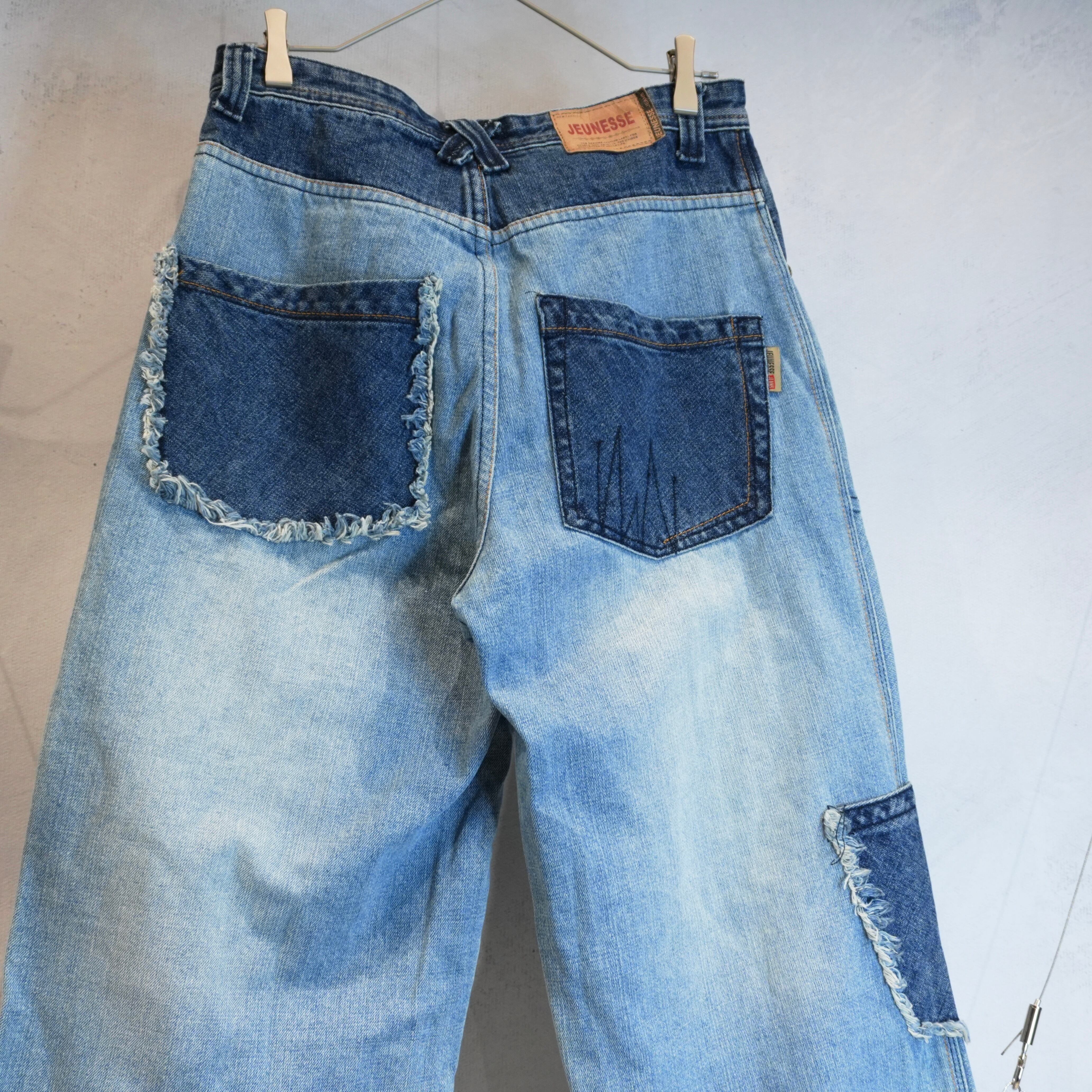 異なる表情のデニムを重ね、切り合わせたアーティスティックなデニムパンツ.