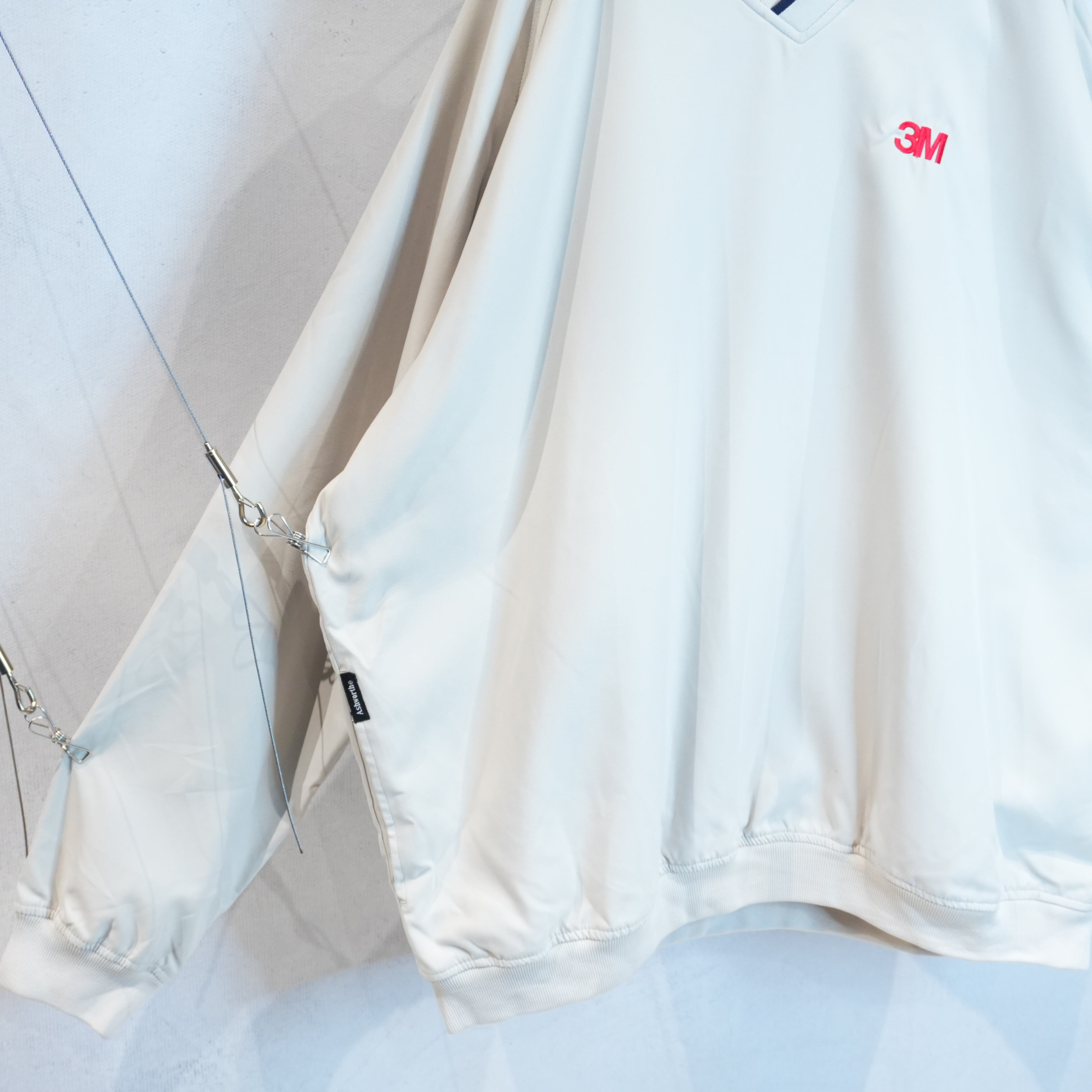 オフホワイトベースのポリエステルタフタ素材を使用したVネック仕様のゴルフプルオーバー.