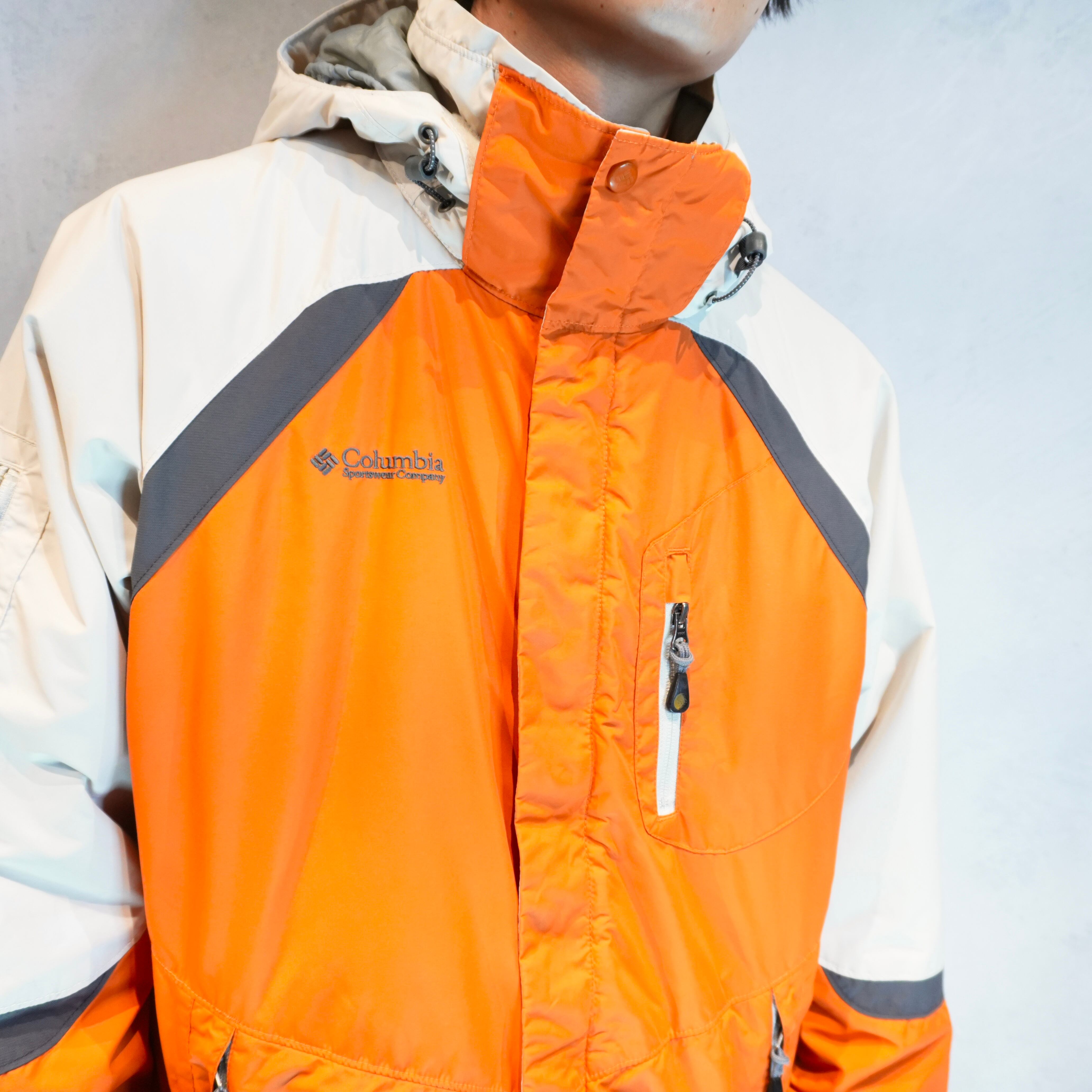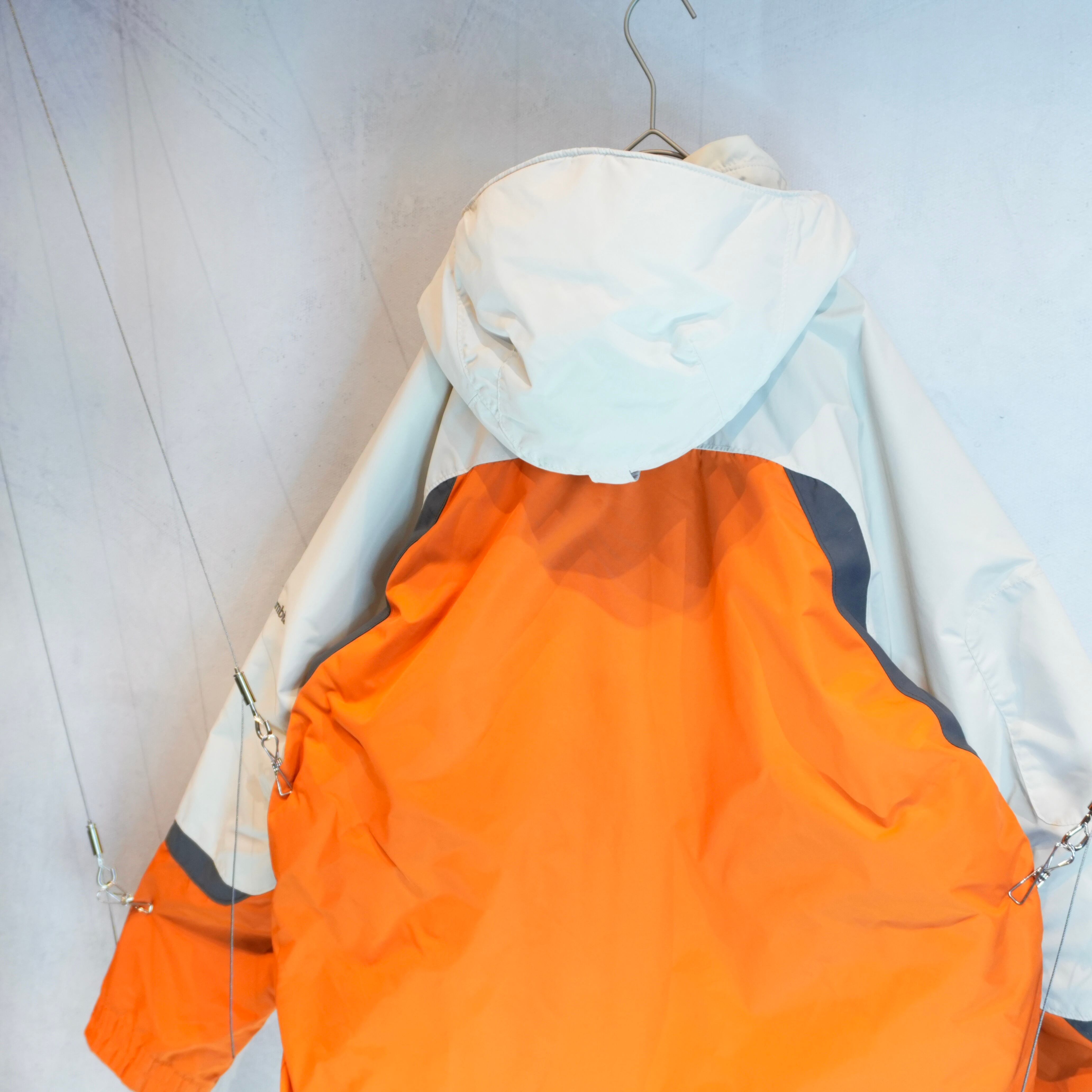 発色の良いオレンジをメインにホワイト×グレーで切り替えたマウンテンジャケットです.