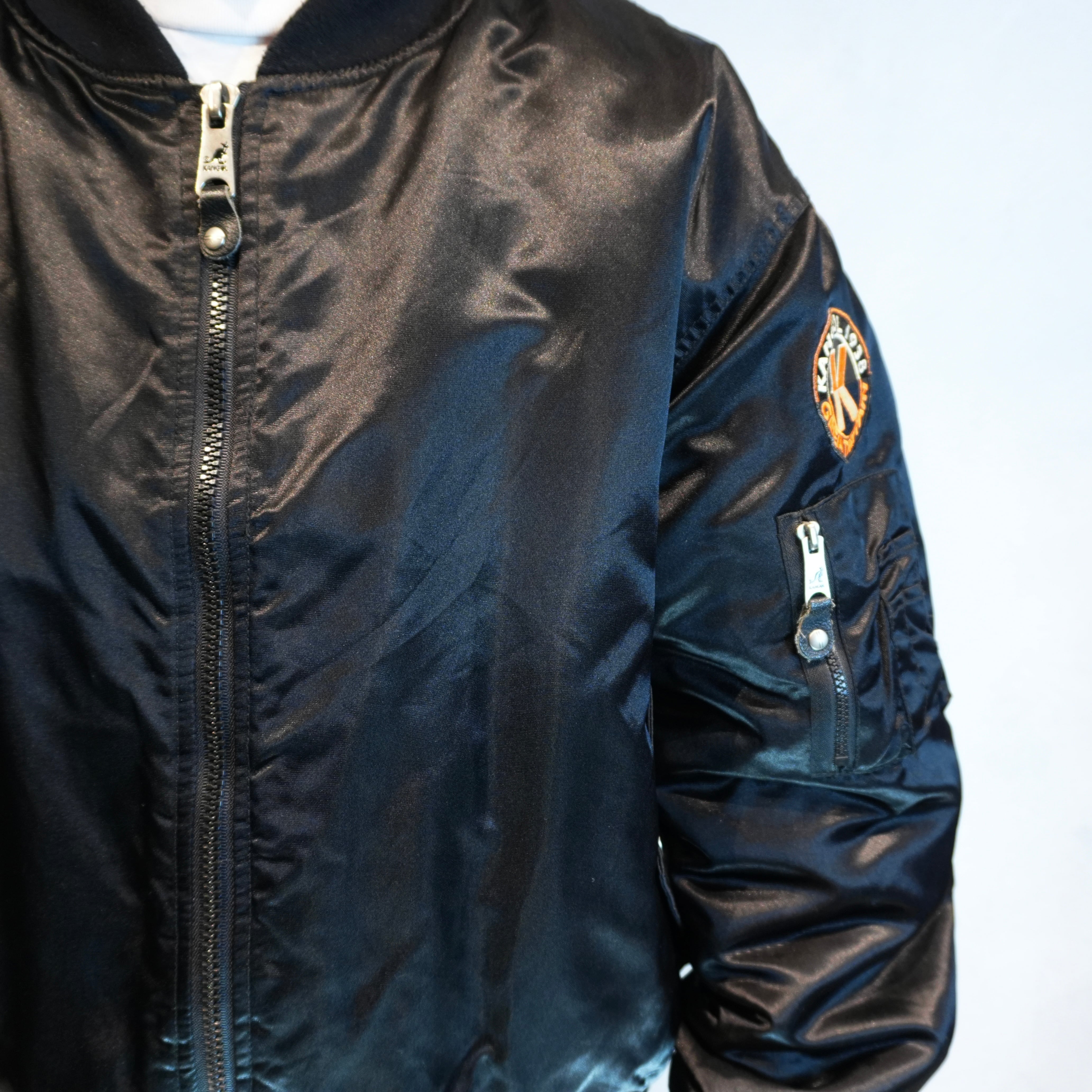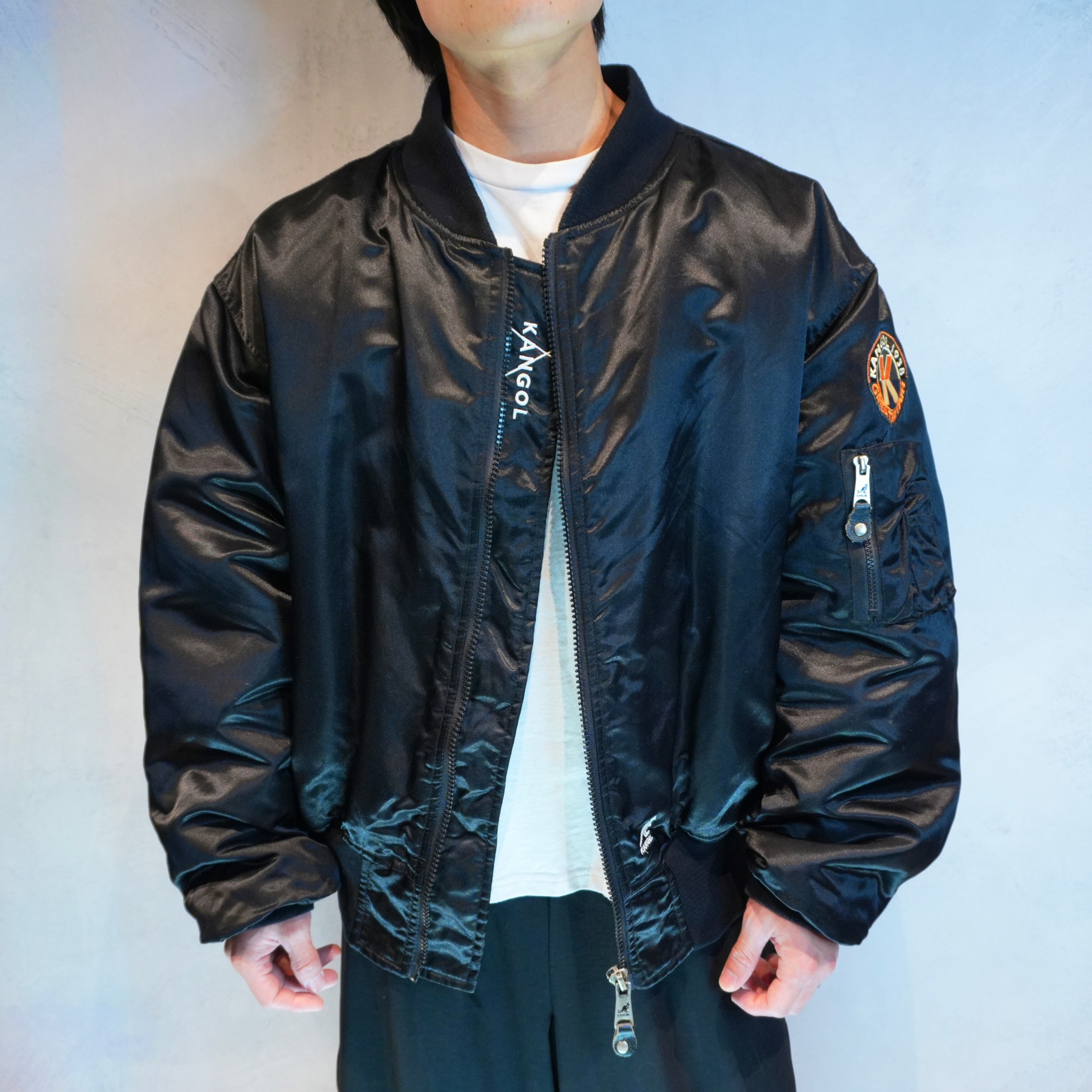 " 'KANGOL' over silhouette black color embroidery design flight jacket "