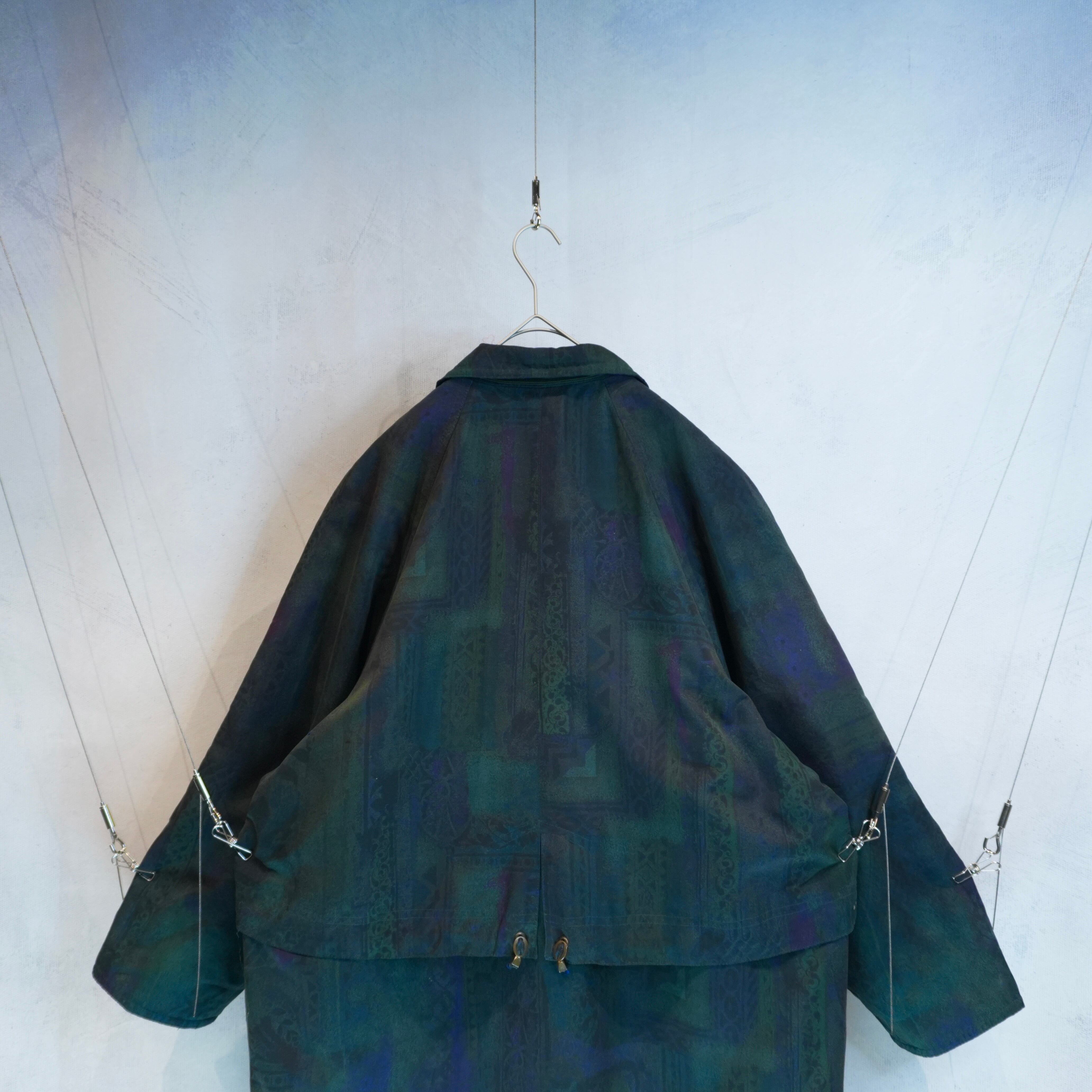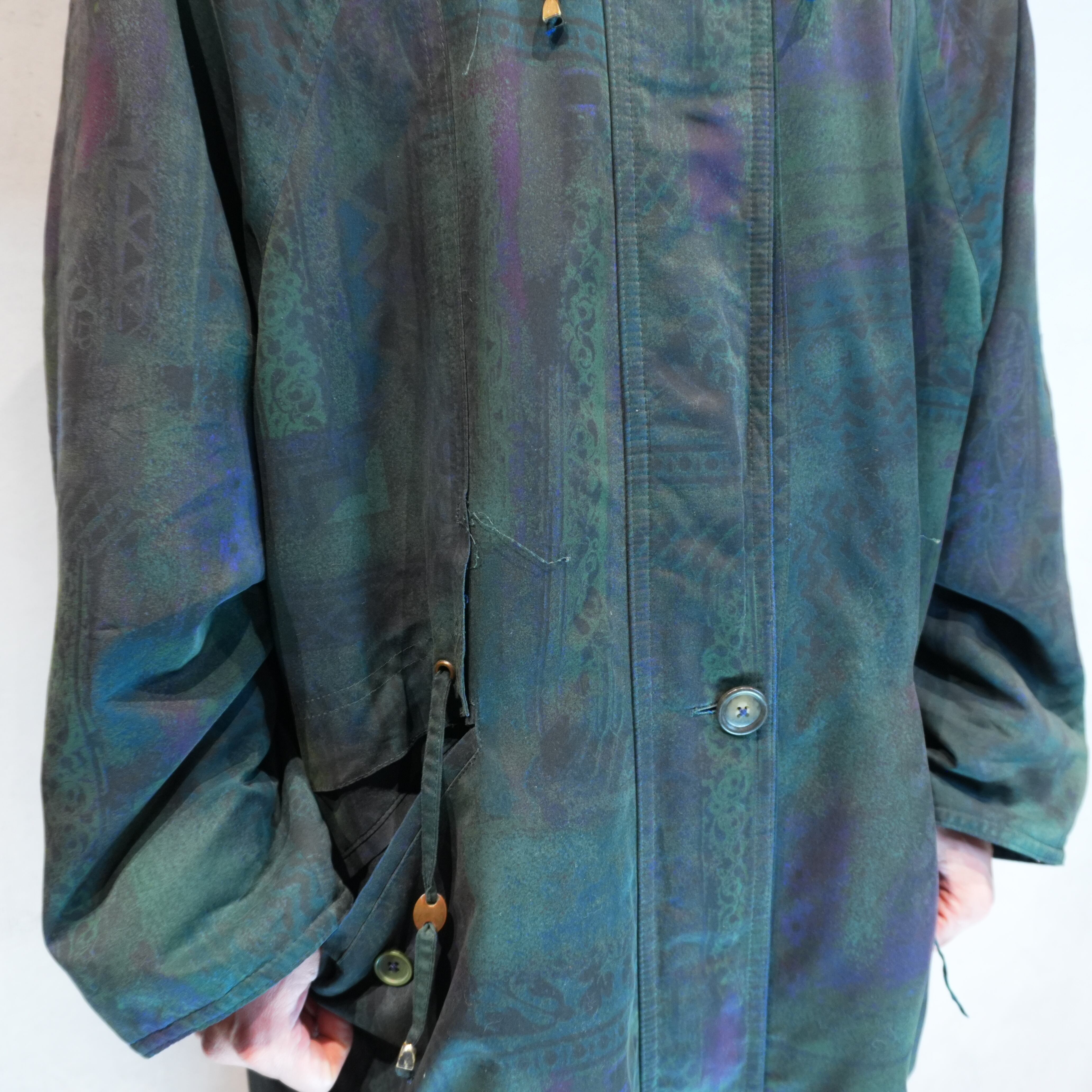 シンプルなシルエットですが、近くで見るとしっかり柄が主張してくる異質なコートです.