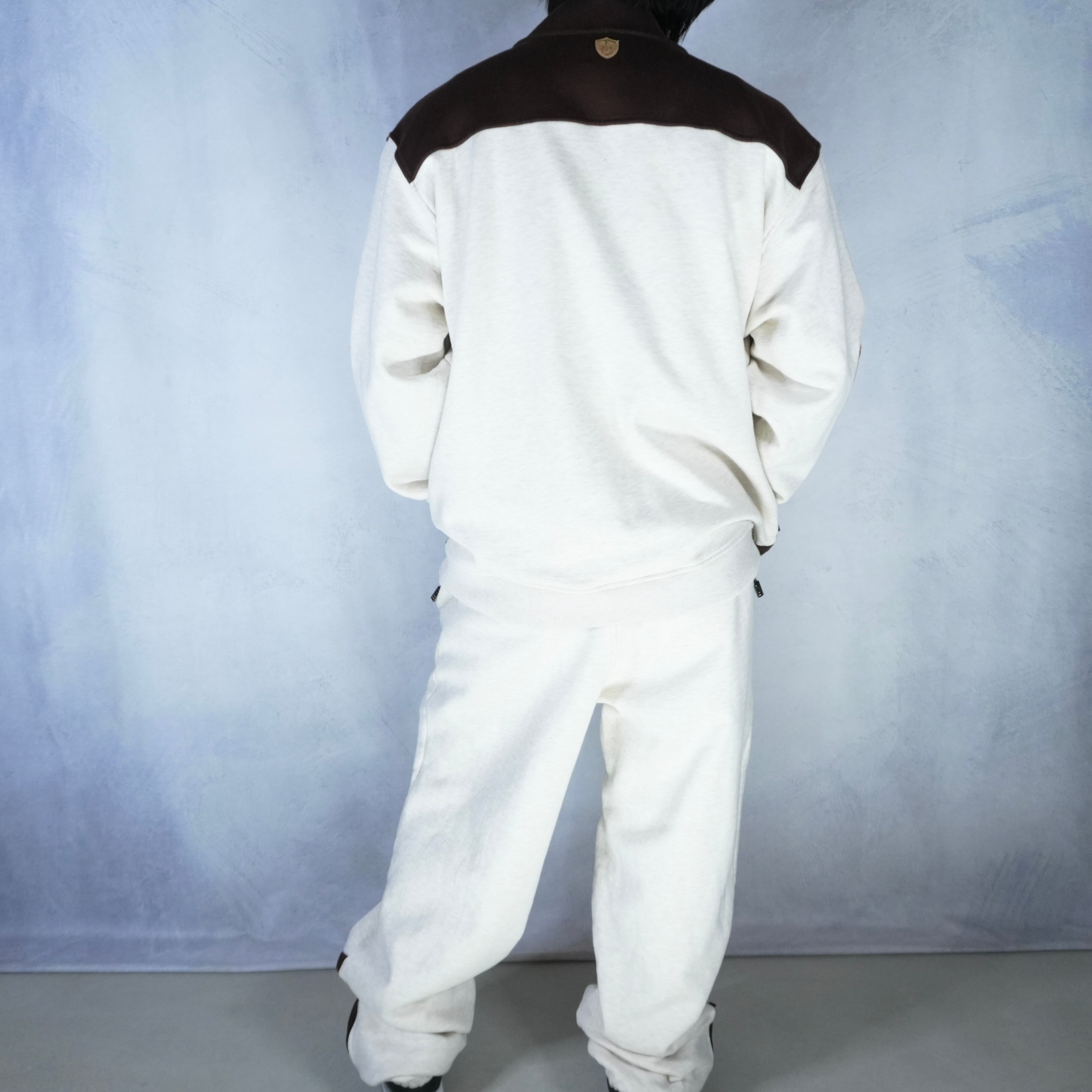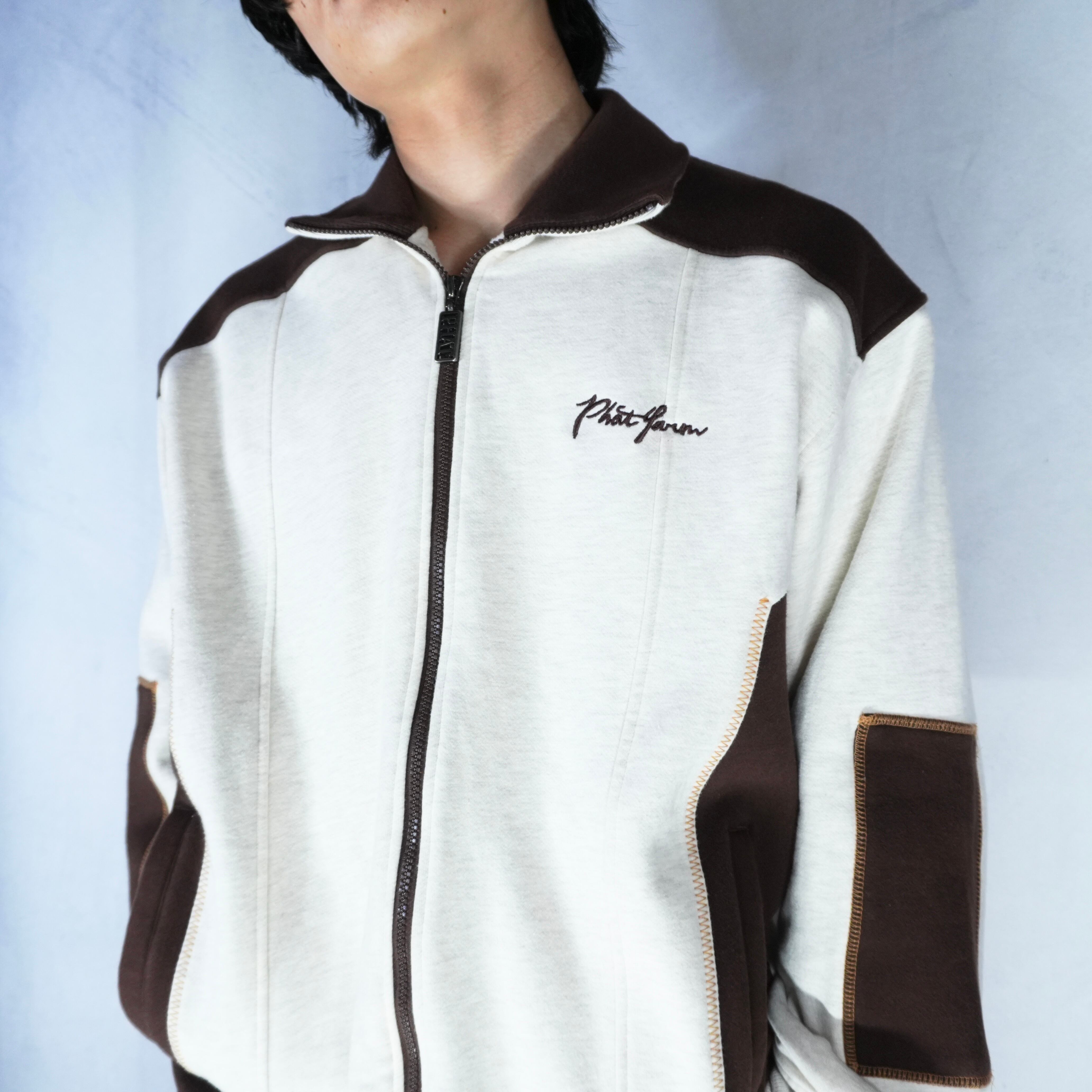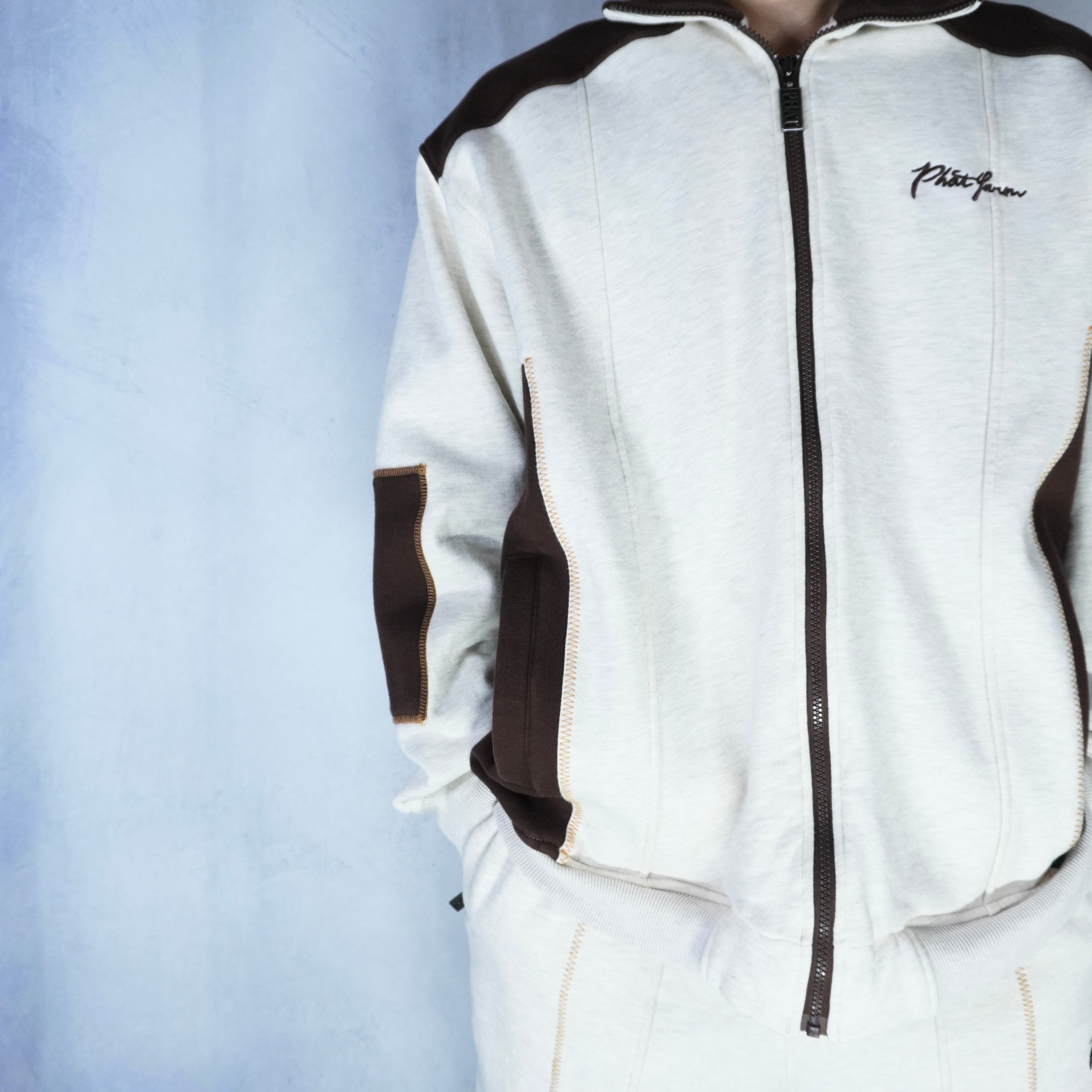 アイボリーベースにブラウンの切り替えが良い配色のトラックスーツ.